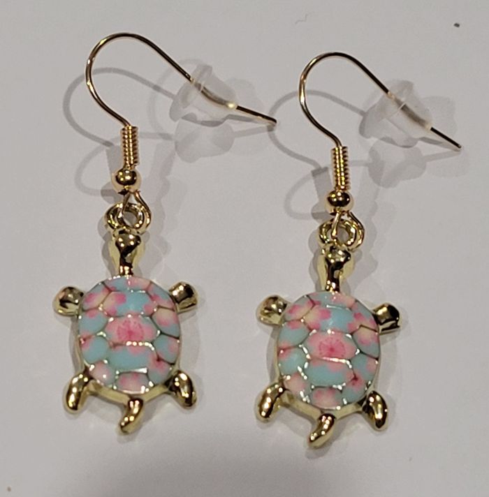 BOUCLES D'OREILLES TORTUE DOREE BLEU ET ROSE ! NEUVE - photo numéro 3
