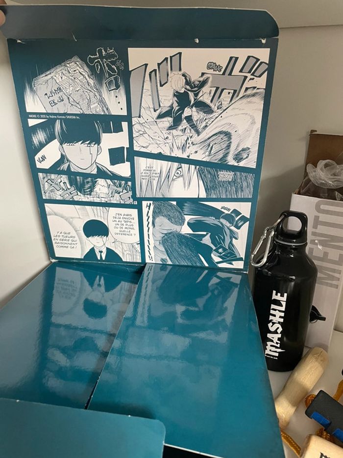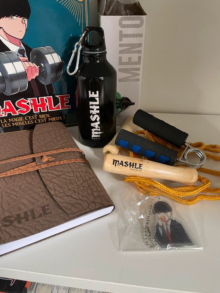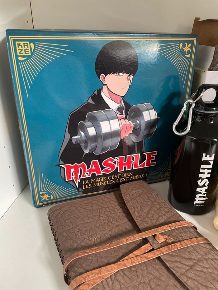 Je vends le service presse du manga Mashle, complet avec livret cuir etc….
