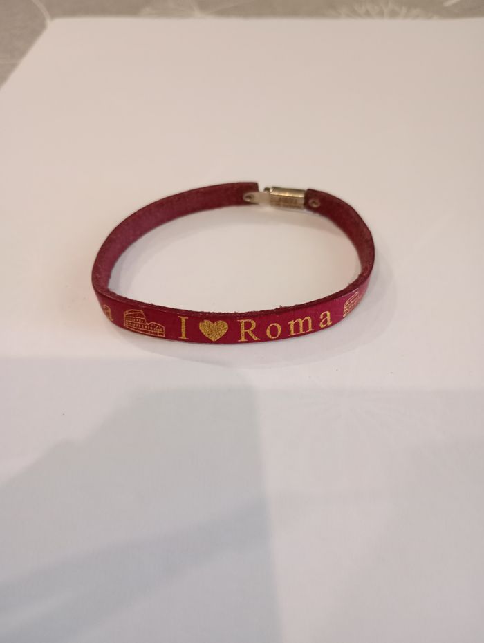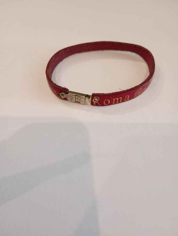 Bracelet rouge avec "I Love Roma" écrit en doré. Je pense que c'est du cuir. Longueur totale : +- 21 cm. Très bon état.