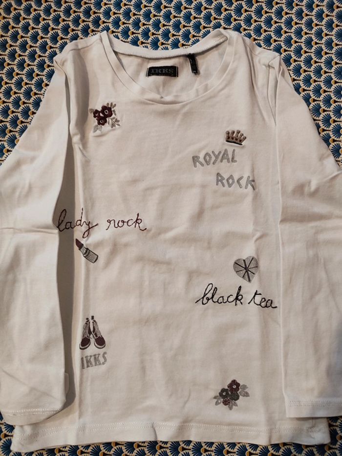 Tee-shirt IKKS Blanc à motifs bordeaux et gris Très bon état Le pantalon bordeaux IKKS fait l'ensemble