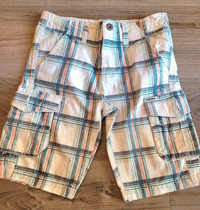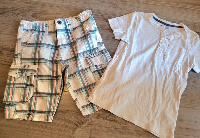 - 1 bermuda à rayures taille réglable marque Creeks 6 ans - 1 tee-shirt blanc manches courtes marque Okaidi 6 ans