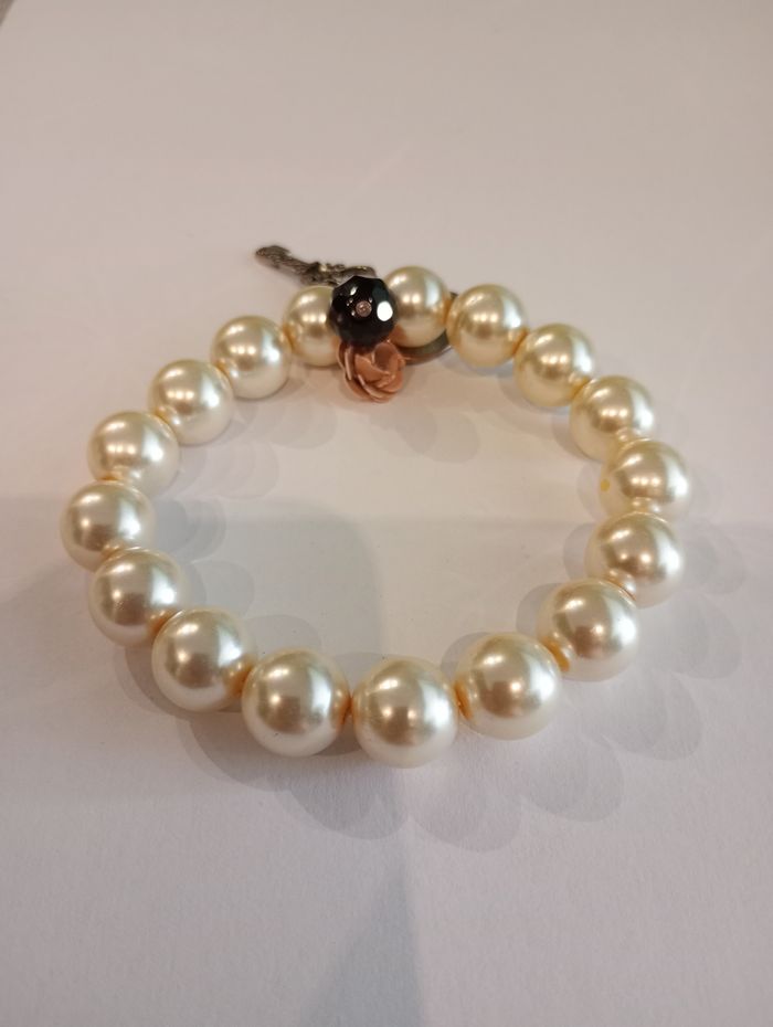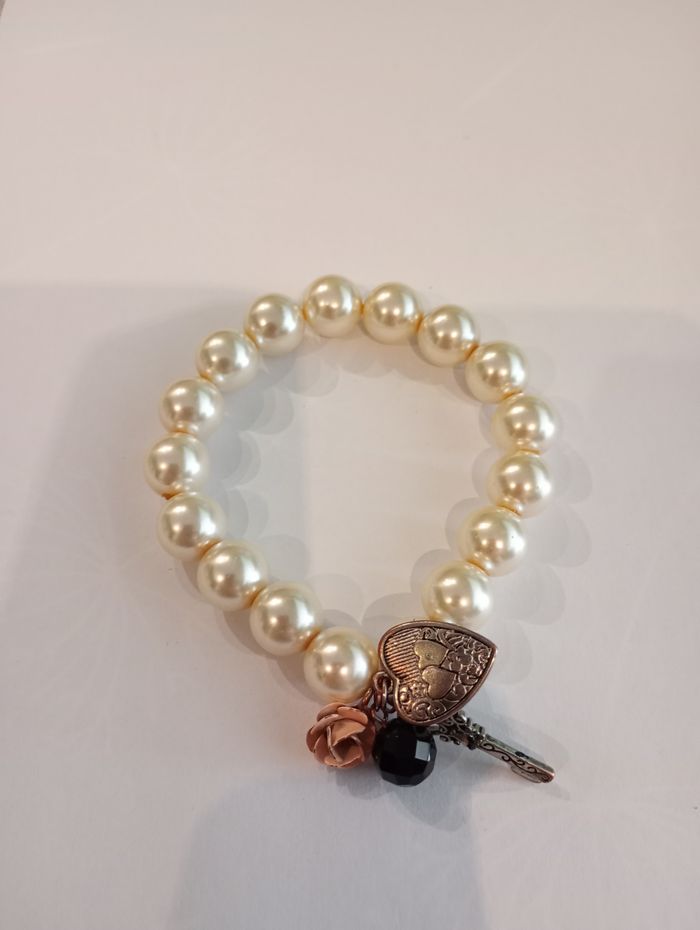 Bracelet avec grosses perles (1 cm) et 4 pendentifs (une rose, une clé, un cœur et une perle noire à facettes). Elastique. Très bon état.