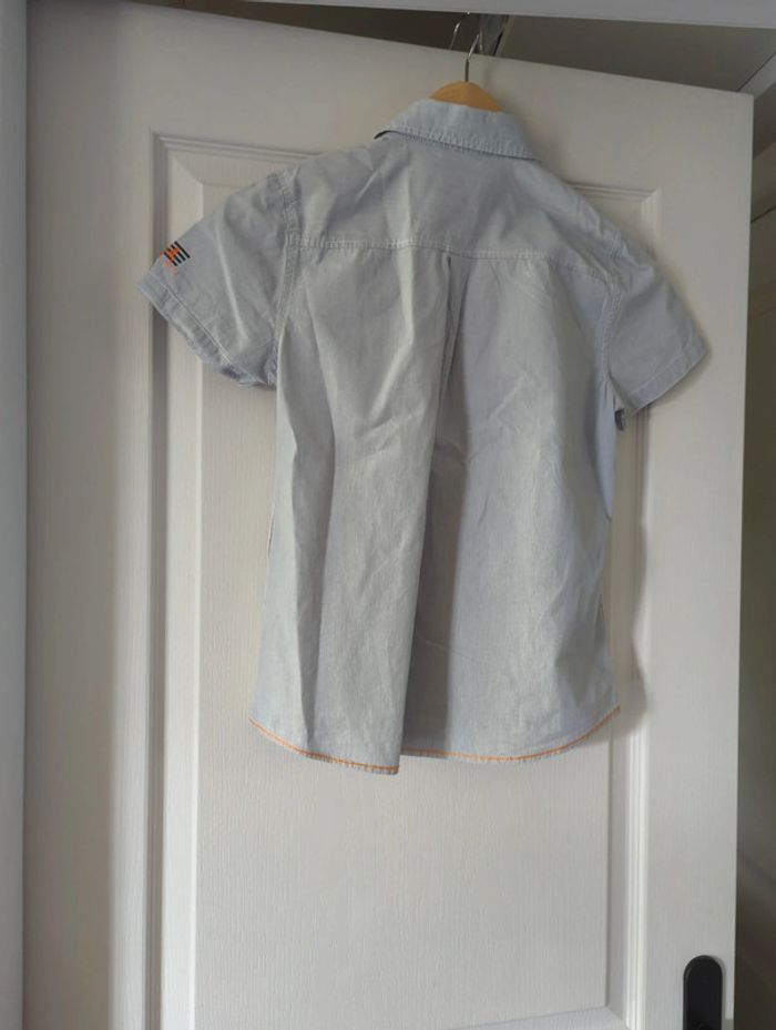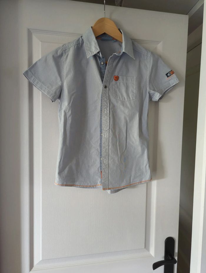Chemise avec boutons et 1 bouton pression. Gris bleu avec de fines rayures.
