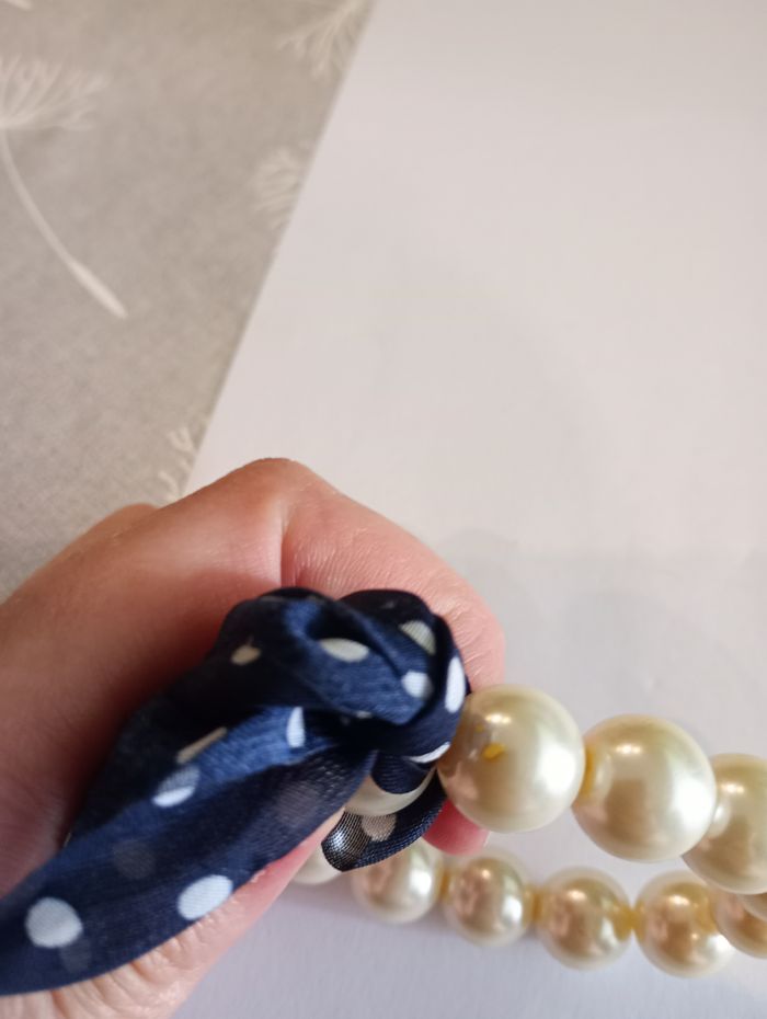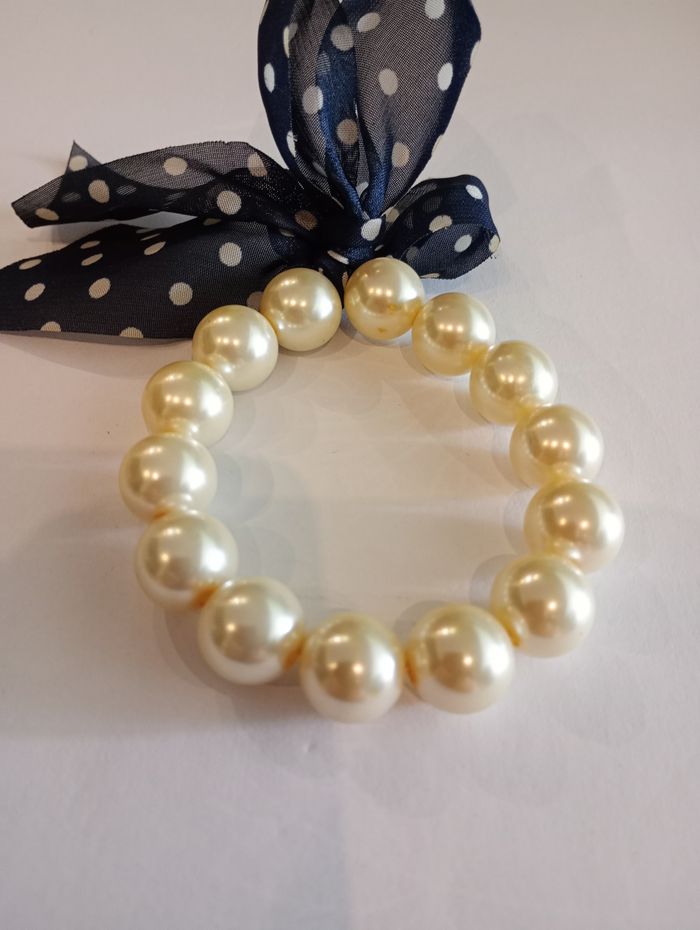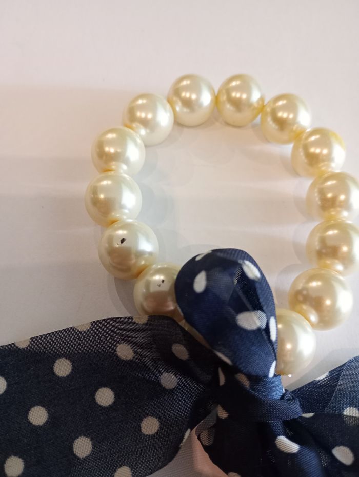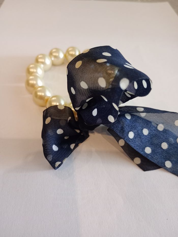 Bracelet avec grosses perles (1 cm) et nœud bleu marine avec pois blancs. Il y a quelques éclats sur une perle mais ça ne se voit pas car c'est caché par le noeud. Deux petites taches noires sur deux perles. Bon état.