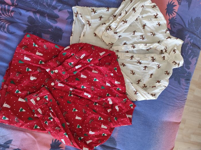 Lot de 2 chemises de Noël, une blanche avec des petits rennes marron et une rouge avec des bonhommes de neige, des rennes et des sapins. Porté qu'une fois chaque, quasi neuve. Taille 4 ans 104cm