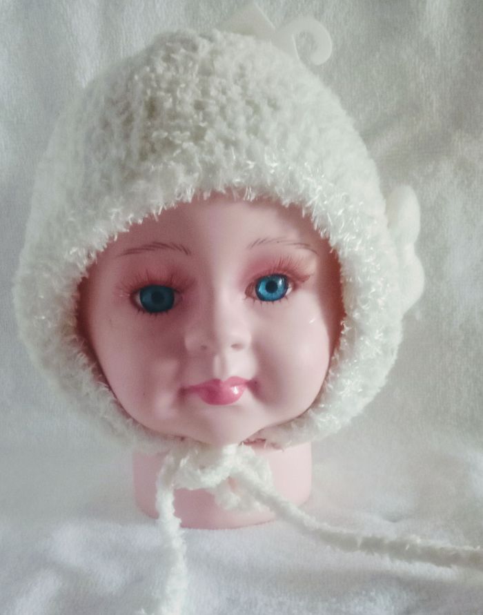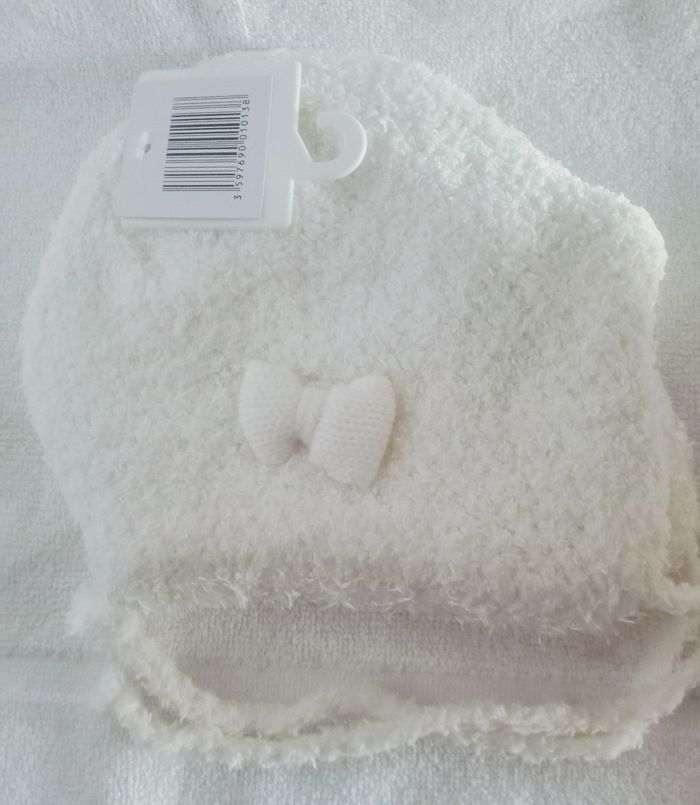 Bonnet blanc avec un nœud sur le côté blanc également NEUF Entièrement doublé 100% polyester Super chaud Fermeture par lacets Tour de cou environ 30cm