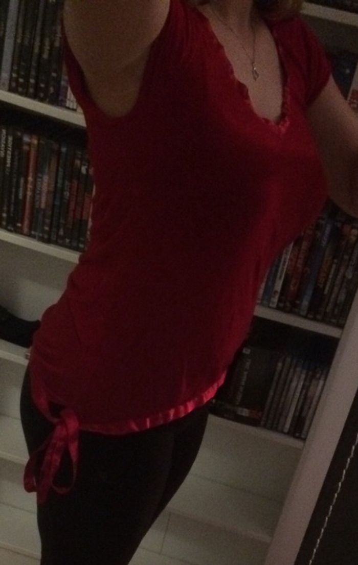 Haut manches courtes rouge top t shirt col V maille et satin La redoute 38/40
