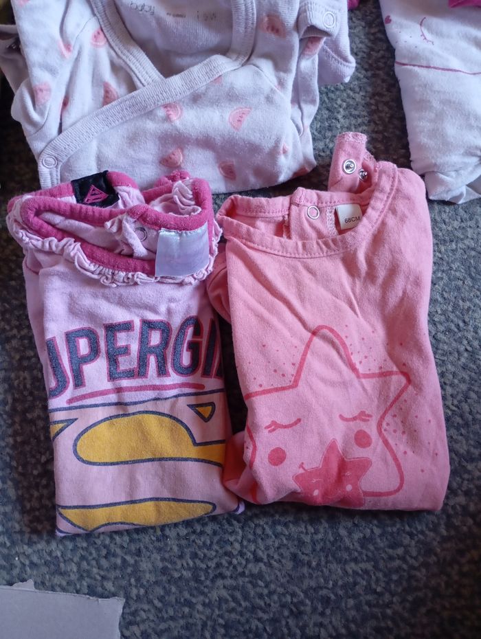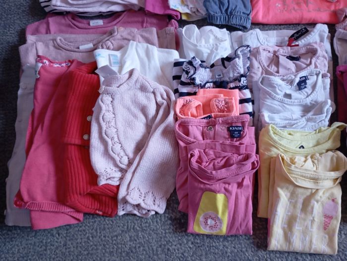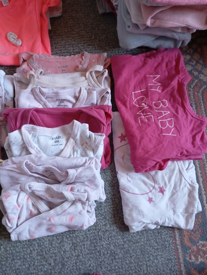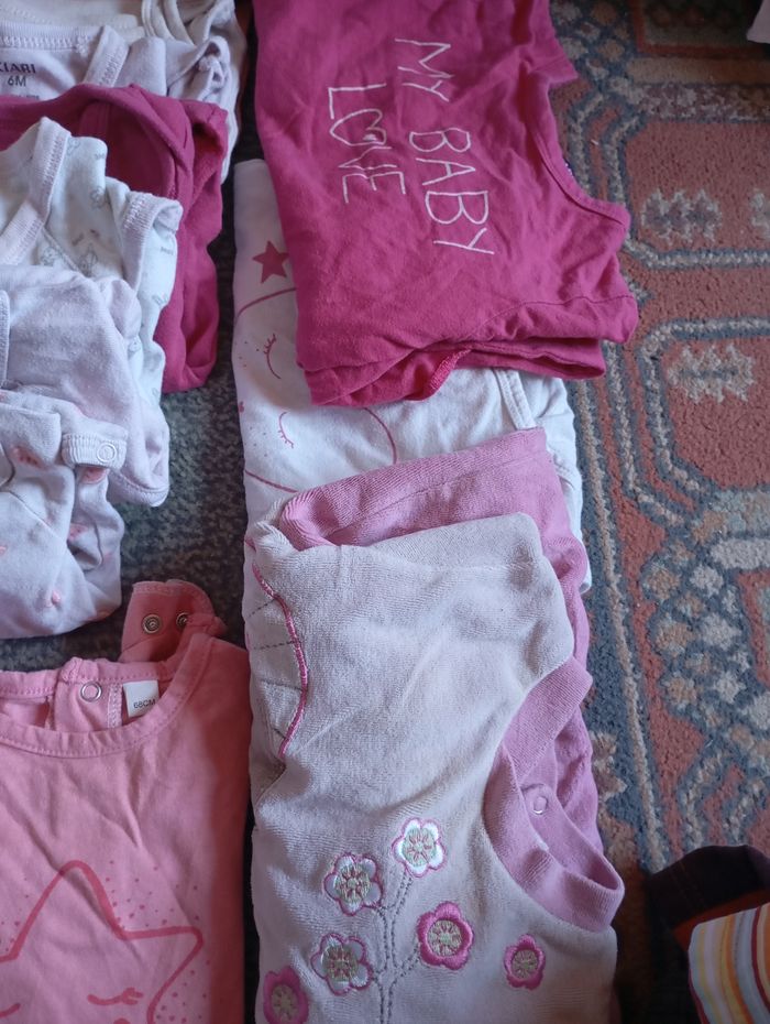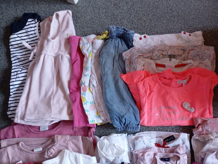 Lot de 3 pyjamas,2 combi short,7 bodies manches courtes,4 tee-shirt manches longues,11 tee-shirt manches courtes,5 gilets,2 pulls ,2 robes et 4 pantalons leggings
