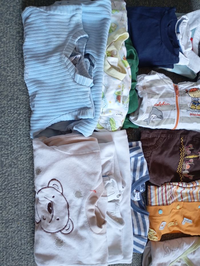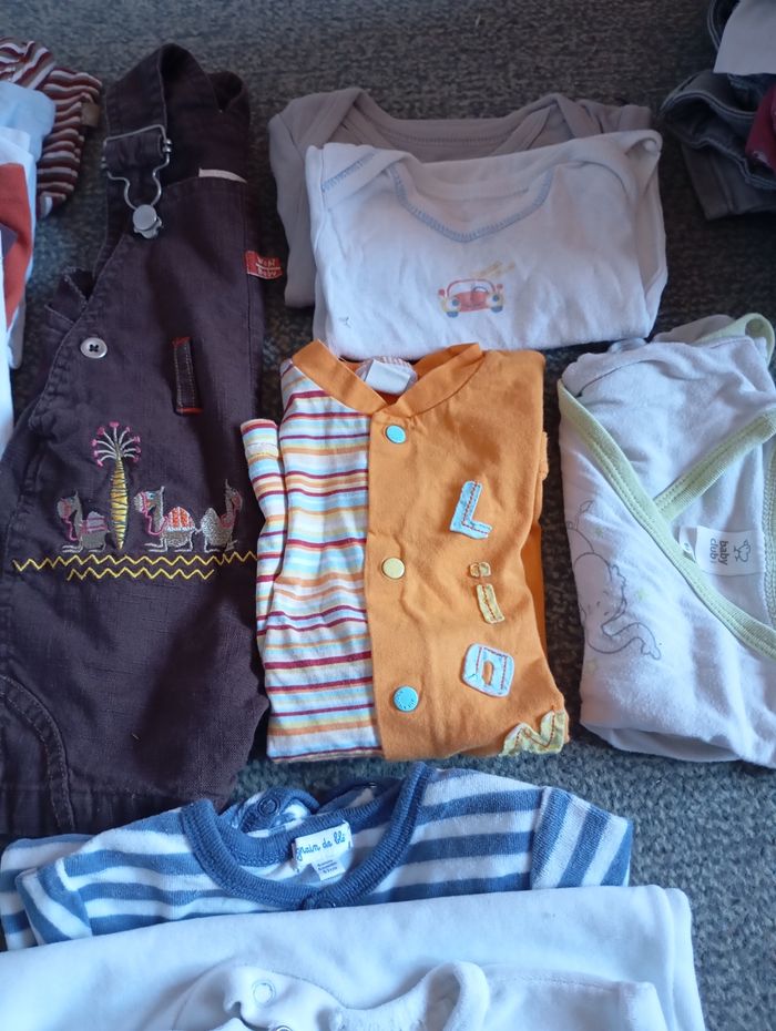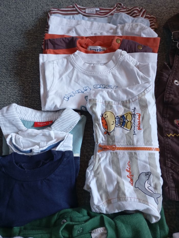 6 pyjamas ,3 tee shirt manches courtes ,1 veste a capuche , 1 salopette short , 1 combi short 2 bodies manches courtes Et 1 manches longues 5 tee shirt manches longues