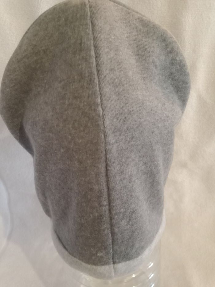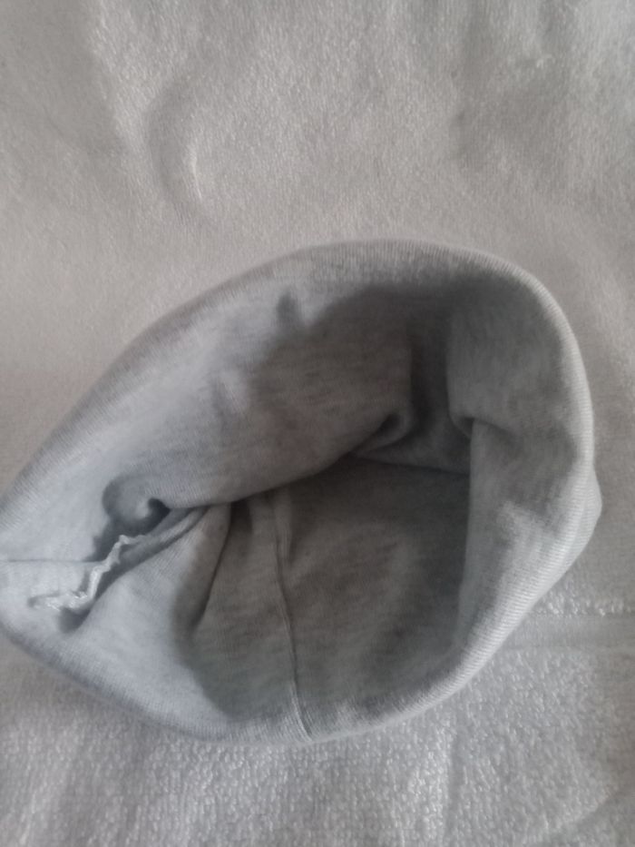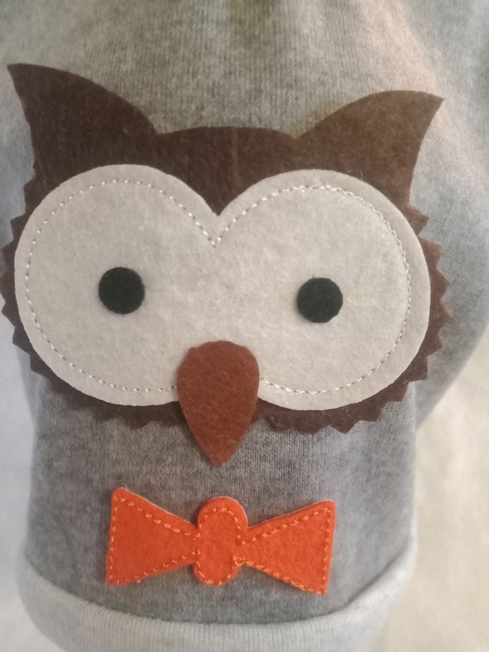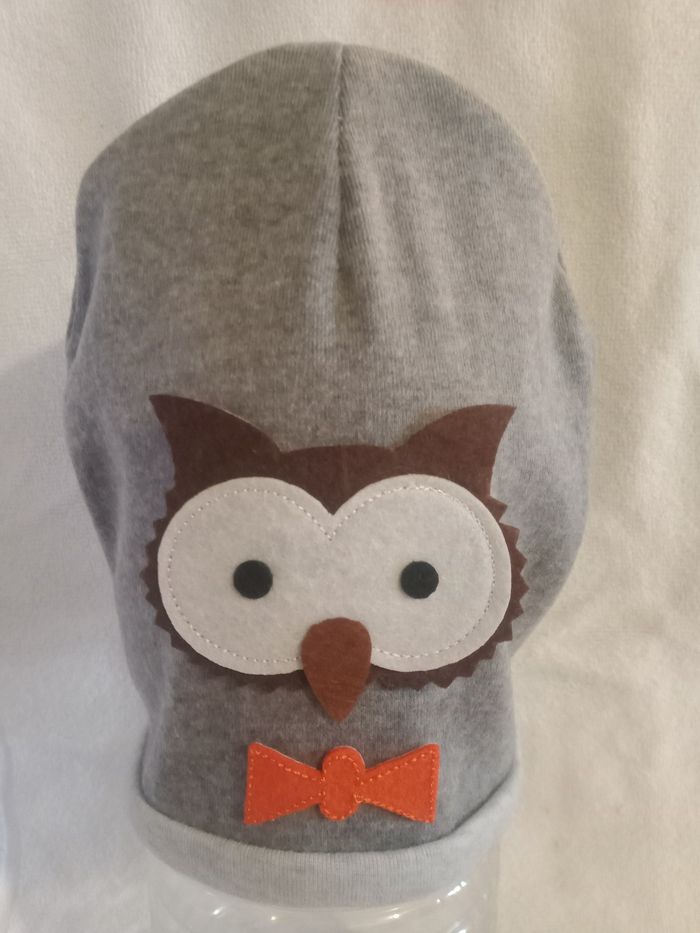 Bonnet avec un hibou au nœud papillon couleur grise L'intérieur est doublé gris Largeur du bas 28 cm sans tiré Neuf mais plus aucune étiquette