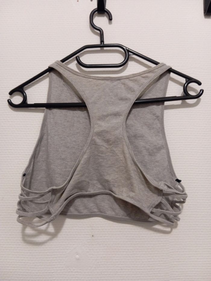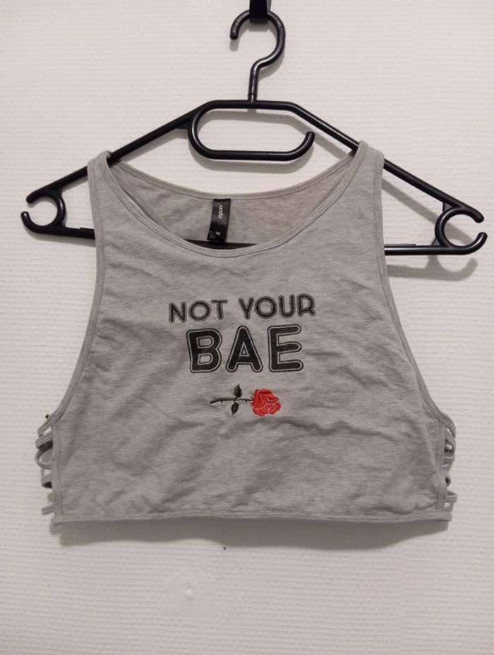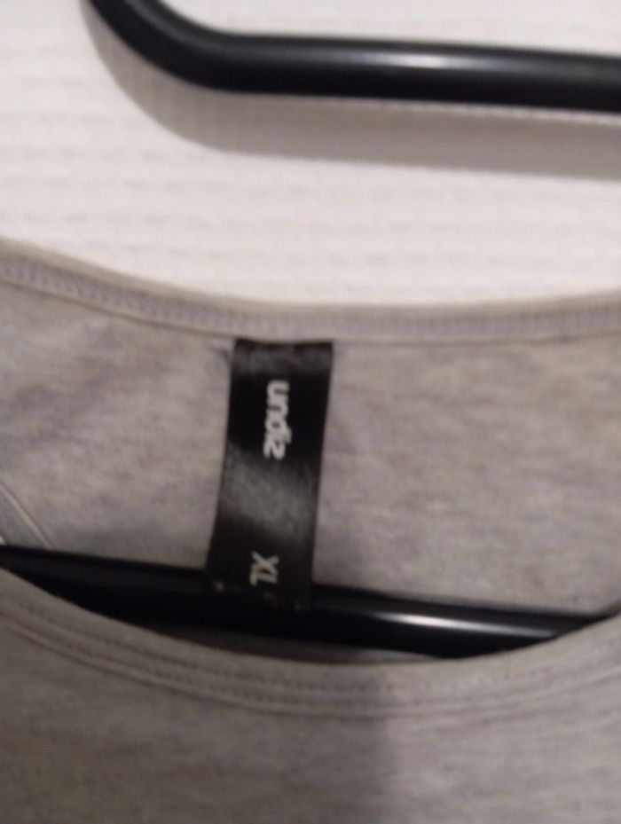 T-shirt sans manche court avec ouvertures sur les côtés Marque Undiz Écrit taille XL mais taille plutôt un L, il est élastique quand même Inscription imprimé et fleur brodée Très bon état