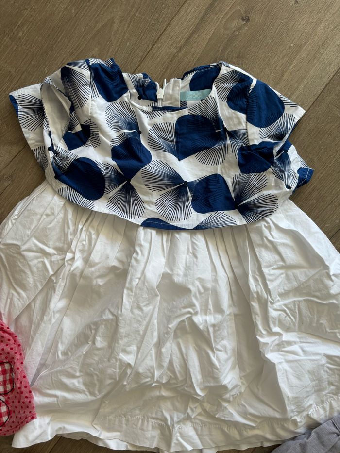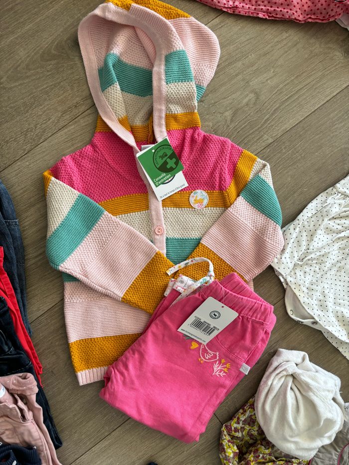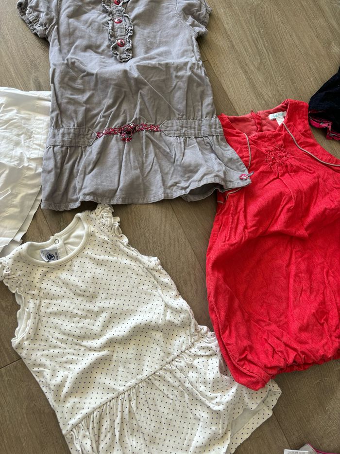1 robe okaidi portée 1 fois pour un mariage (1 tache en photo) 1 robe petit bateau jamais portée 2 robes velours 1 robe petit pois 1 jupes velours 1 gilet en maille entièrement doublé en polaire 1 gilet neuf avec étiquette compagnie des petits 1 pantalon avec étiquette compagnie des petits 4 pantalons 1 legging 2 t shirt okaidi manches courtes 6 t shirts manches longues 1 short rouge okaidi 1 blouses sans manche okaidi 2 pyjamas 2 bodies 1 paire de collant