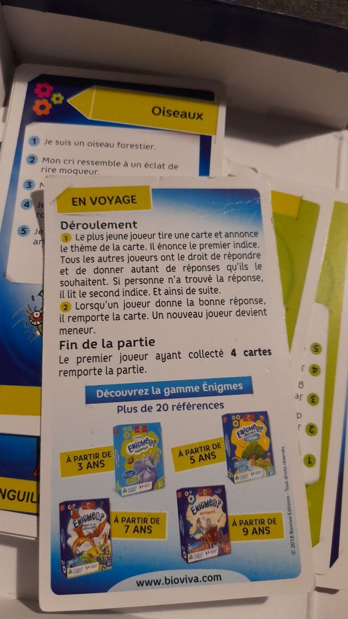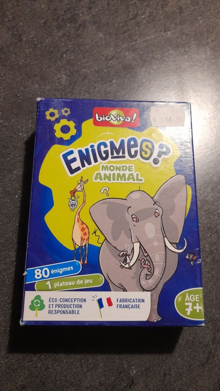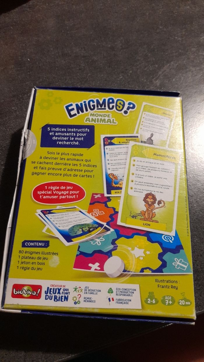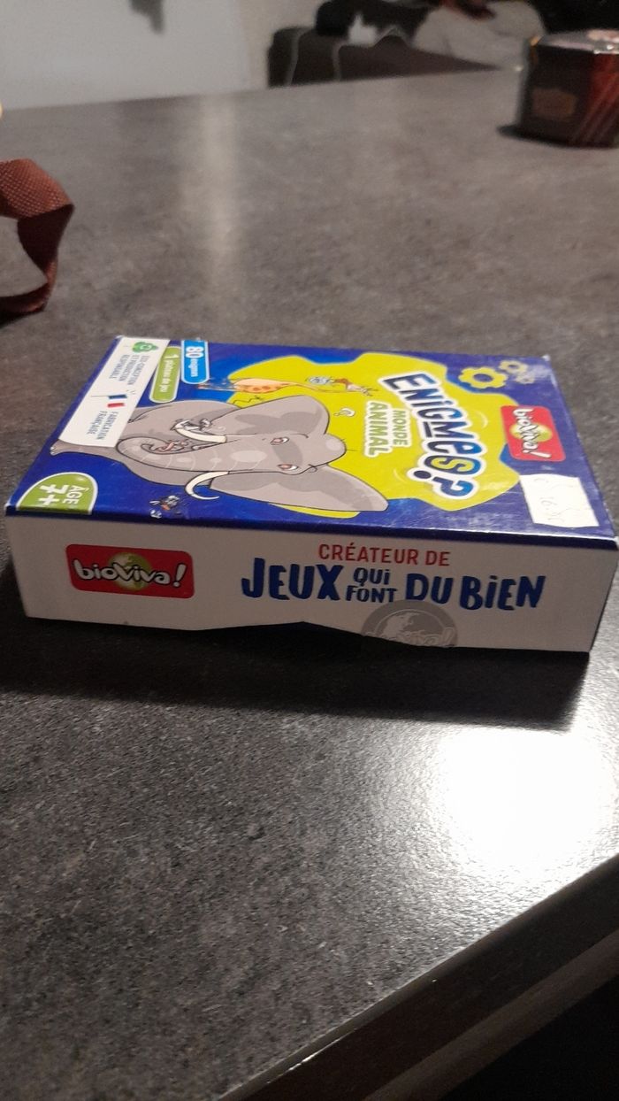 Jeu de société, de marque bioviva! Complet et en bon état, avec 80 énigmes, soit 40 cartes, 1 plateau de jeu, un pion et la règle du jeu. Conseillé au plus de 7 ans.