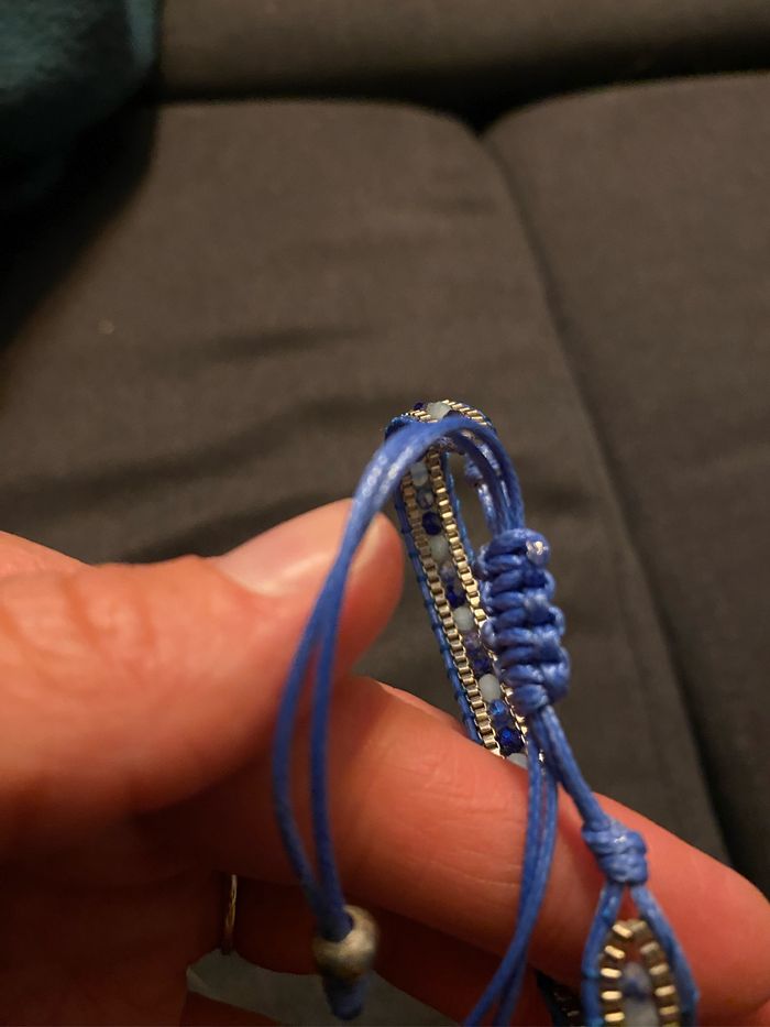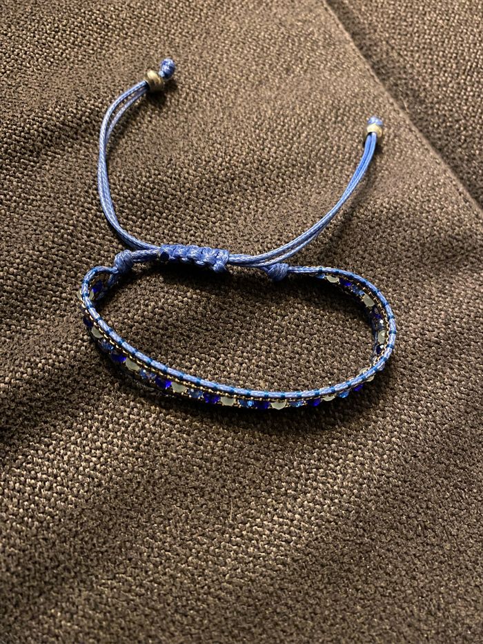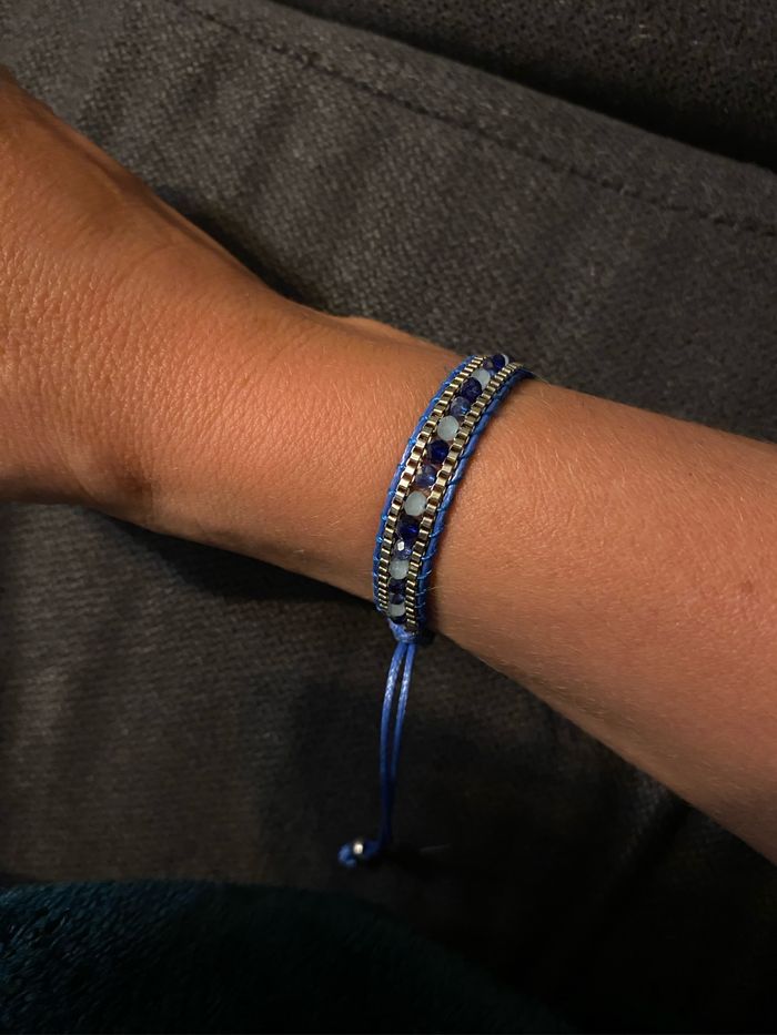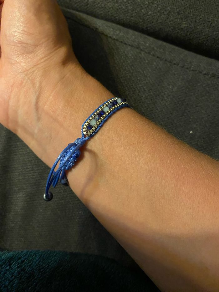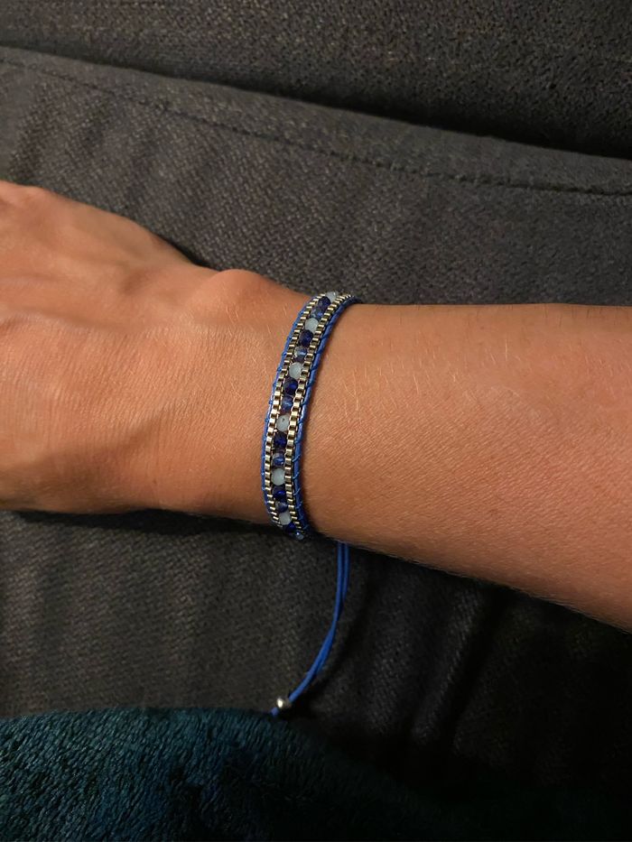 Bracelet perles bleues, ajustable. Comme neuf, peu porté.