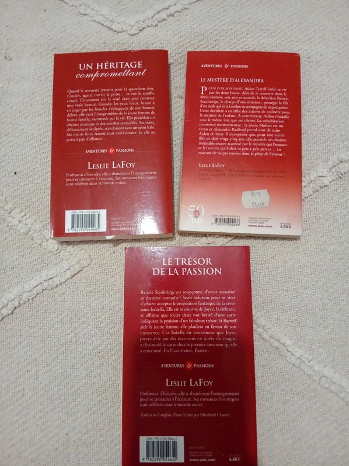 Trilogie perfect Auteur Leslie Lafoy Tome 1 un héritage compromettant Tome 2 le mystère d'alexandra Tome 3 le trésor de la passion Très bon état Quelque trace d'usure Romance historique