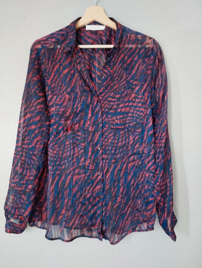 #dressingtailleSnouslesnanas Chemisier de la marque Promod, matière fluide. Couleur bleu marine, noire et rouge avec filaments brillants. Très bon état. Étiquette coupée mais taille S.