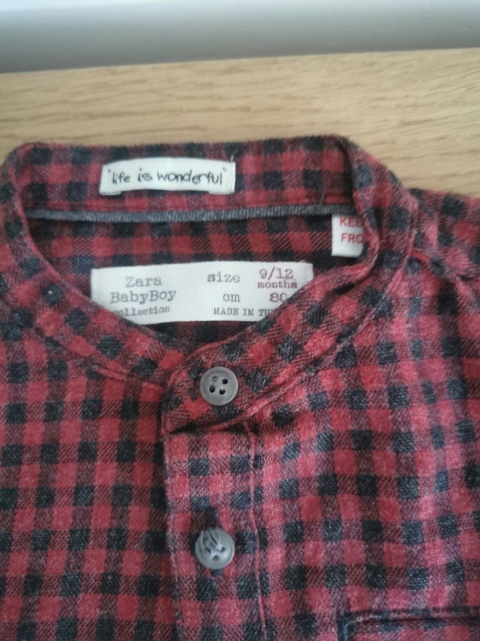 Chemise à manches longues de la marque zara en coton et acrylique. C'est une taille 9/12mois (80cm), elle est en très bon état mais il manque un bouton au niveau de la manche.