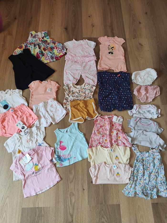 Lot de vêtements 3 mois fille : robes, combi short, barboteuses, bodys manches courtes, bloomers, shorts, haut manches courtes...