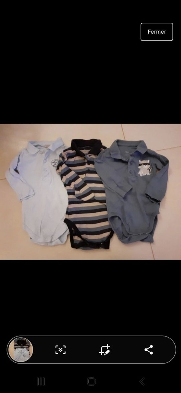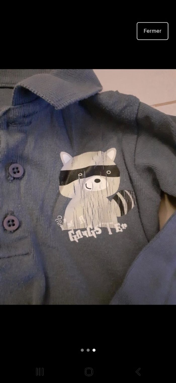 Lot de 3 bodies avec col imitation chemise 2 bodies de la marques TeX 1 bodie de la marque grain de blé Le dessin d'un des bodie est légèrement abîmé par le lavage. Possibilité de vendre séparément
