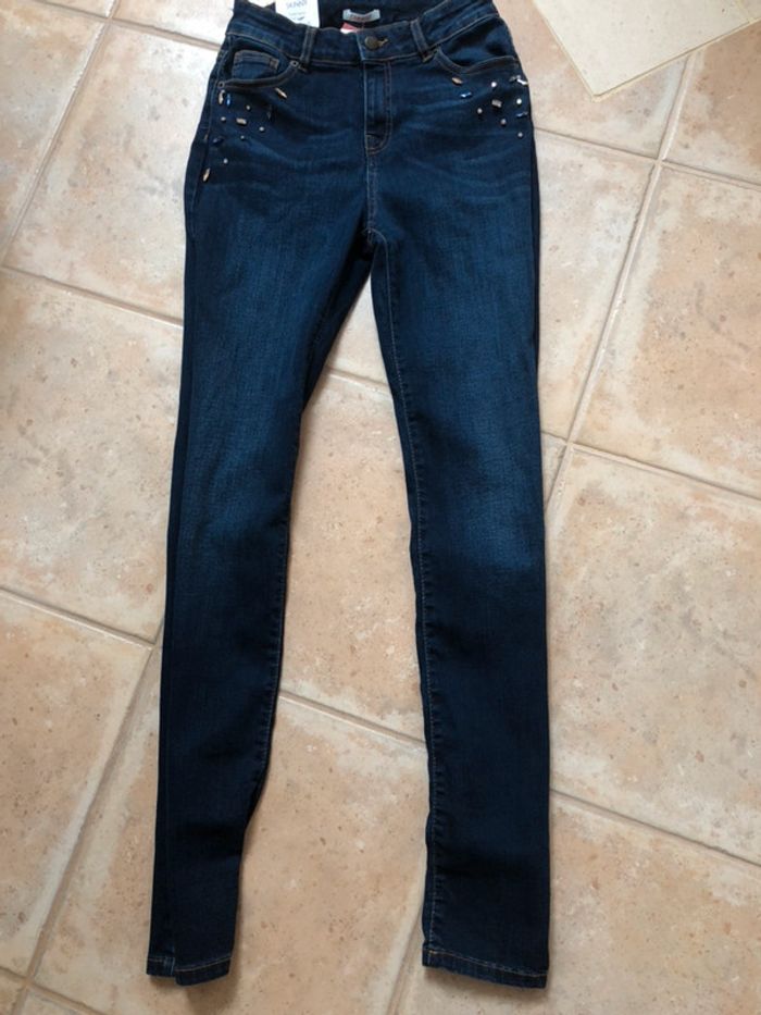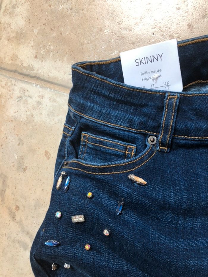 Bonjour, très beau jean incrusté de de petits Swarovski (style) taille 40 mais convient plutôt à un petit 38 étiquette présente (35,99€)