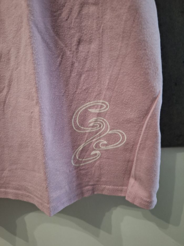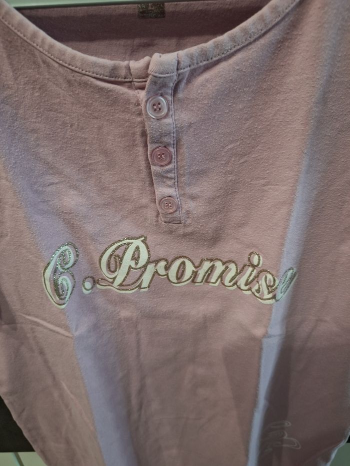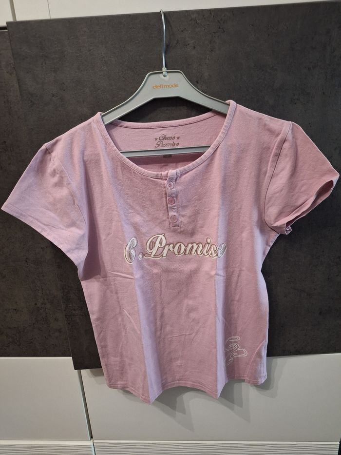Joli t-shirt manches courtes rose avec inscriptions blanches et pailletées devant, 3 boutons à l'encolure, marque Chose Promise, taille L, peu porté en très bon état