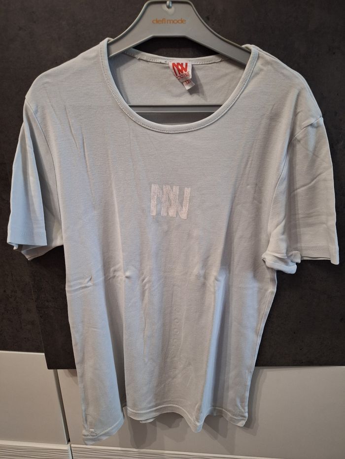 T-shirt manches courtes bleu ciel avec logo Dorotennis blanc devant un peu craquelé, taille 2 soit 38, porté mais en bon état