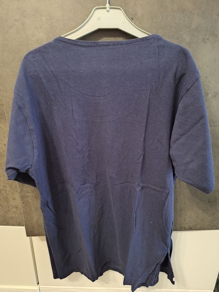 Joli t-shirt manches courtes bleu marine avec liserets blancs à l'encolure et en bas, fentes côtés, plus d'étiquette taille 40/42, porté mais en très bon état
