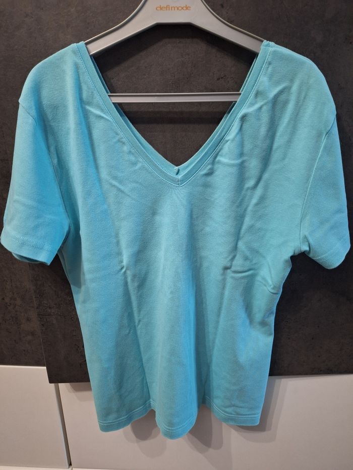 Joli t-shirt manches courtes bleu turquoise, encolure V devant et dos, marque Autre Ton, taille L, porté mais en très bon état