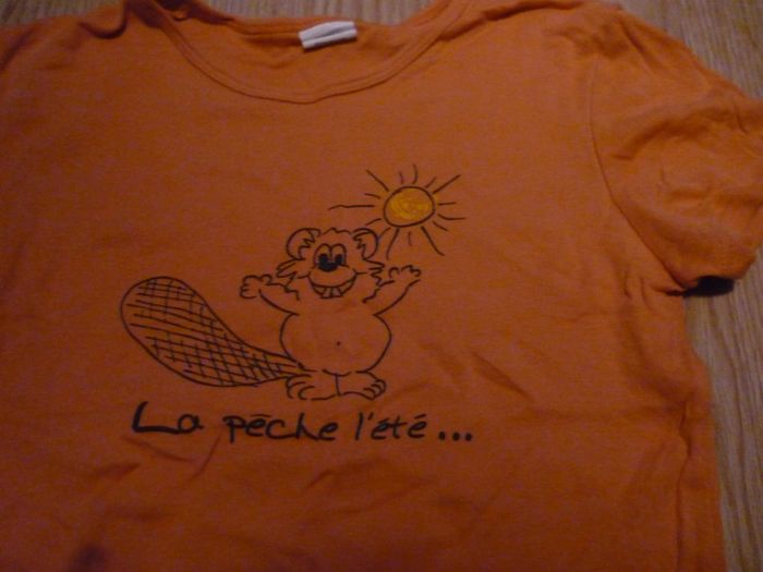 Joli t-shirt MC orange recto verso message un castor la peche l'été (devant)et à plat l'hiver (au dos ) taille 2 femme #ecritaviefemmes il s'agit d'un petit taille 2
