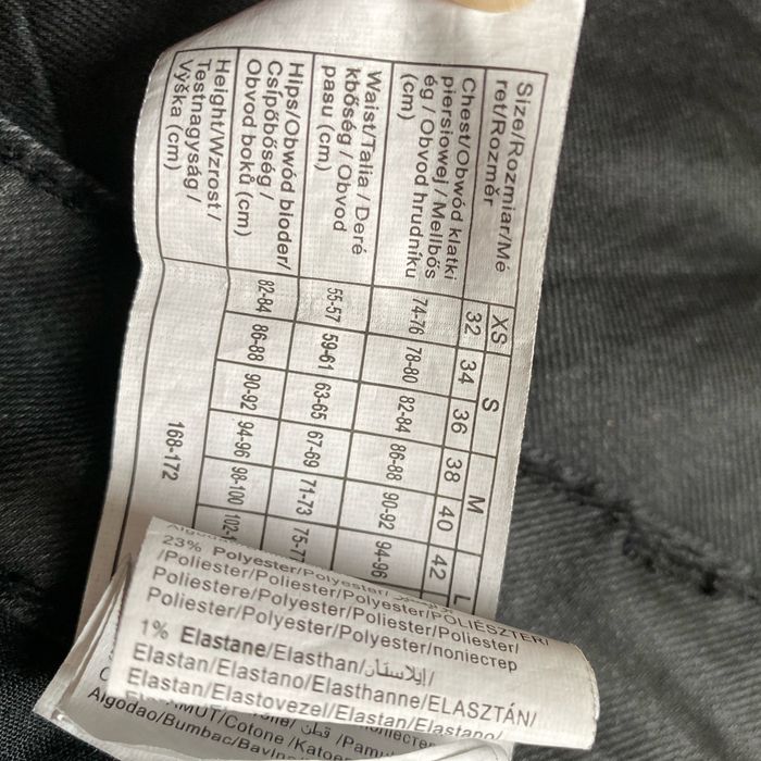 Jupe noire tissu enduit Taille 38 76 % coton, 23 % polyester 1 % élasthane Pimkie La ceinture mesure à plat sans tirer 39 cm, va jusqu’à 42 cm en tirant Longueur milieu devant 33 cm Longueur milieu dos 34,7 cm
