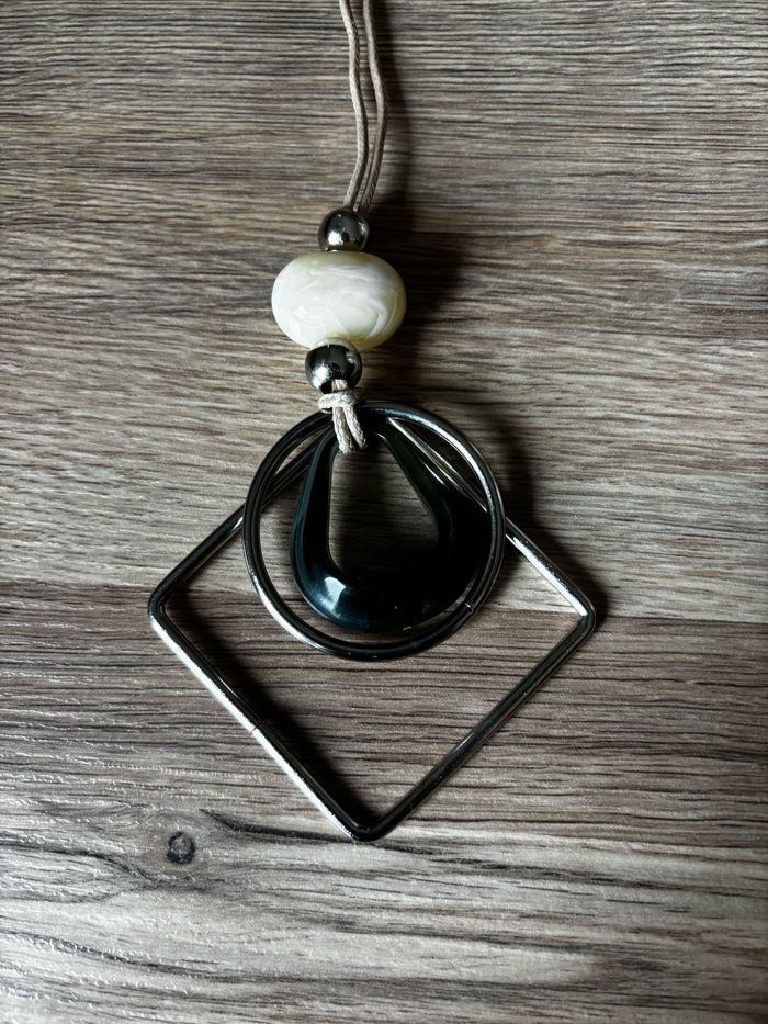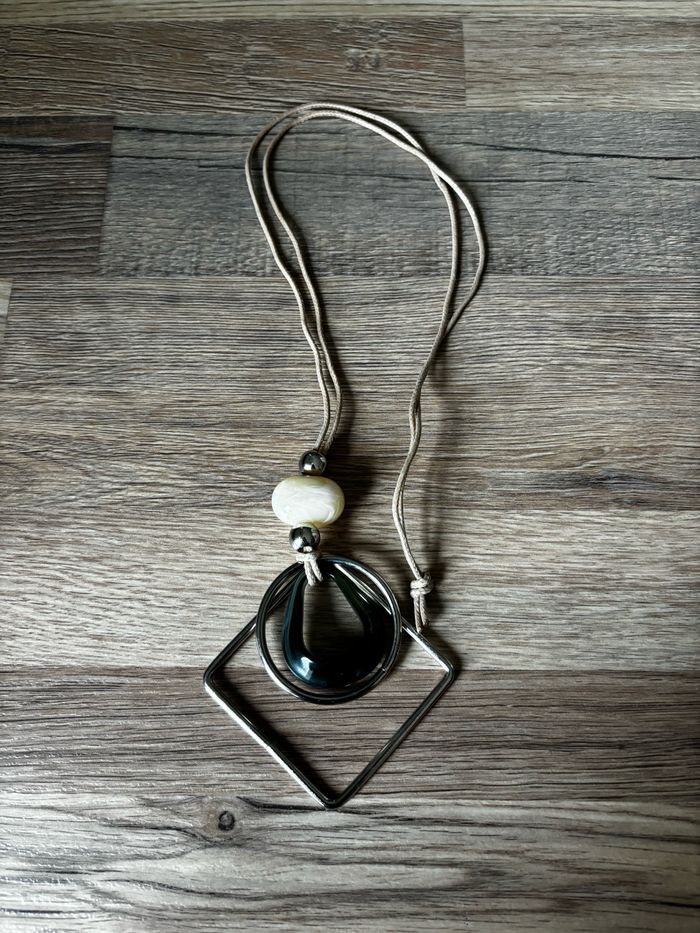 Joli collier fantaisie bohème Métal et perles style pierres beige et vert très foncé Fil beige Pas de fermoir : juste un noeud Neuf jamais porté