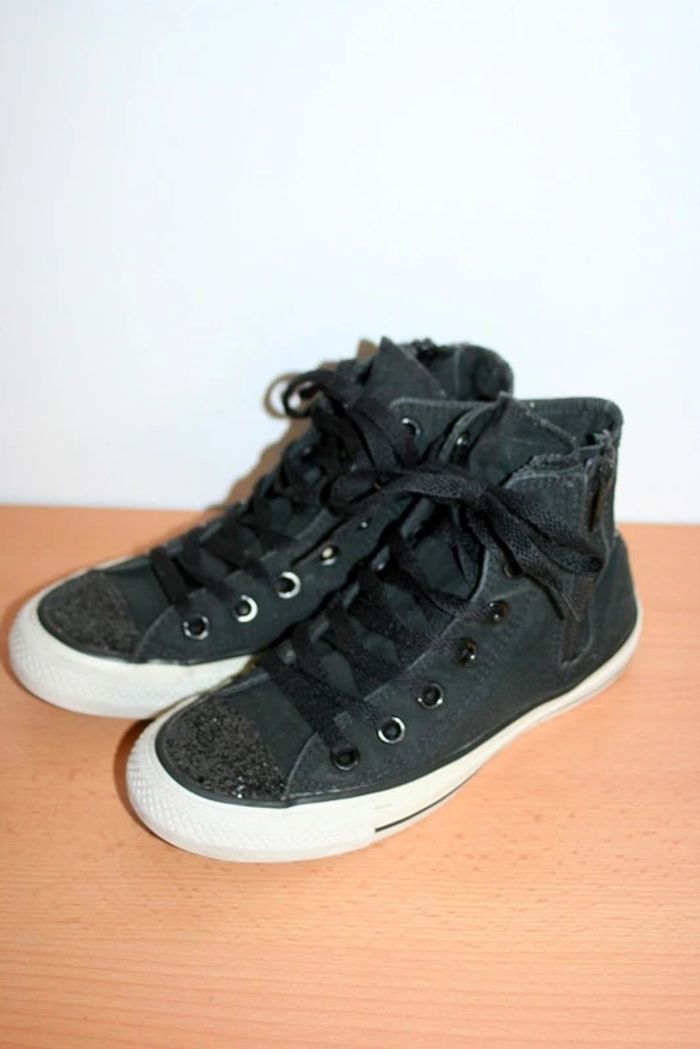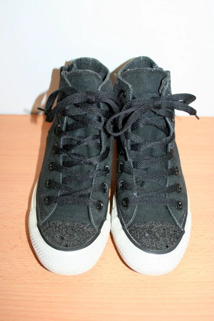 Converse All Star noires pointure 36, brillants sur le bout avant et l'arête arrière (abimé sur l'arête cf photo), peu portées, 740g