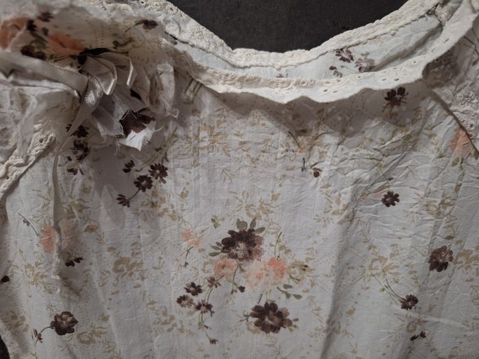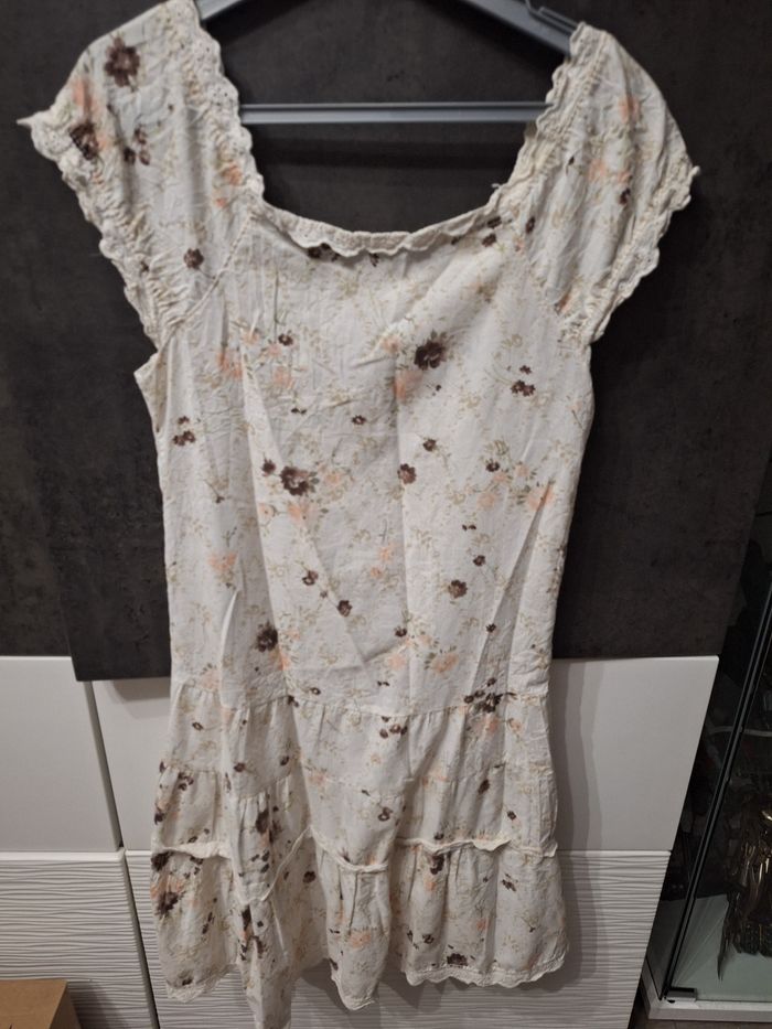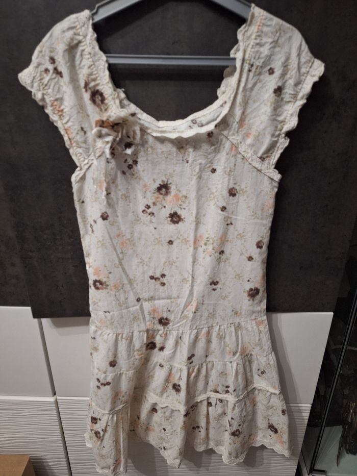 Jolie robe sans manches blanc cassé avec motifs fleurs rose et marron, effet de volants au bas, fleur en tissu devant, plus d'étiquette taille 14 ans, peu portée en très bon état