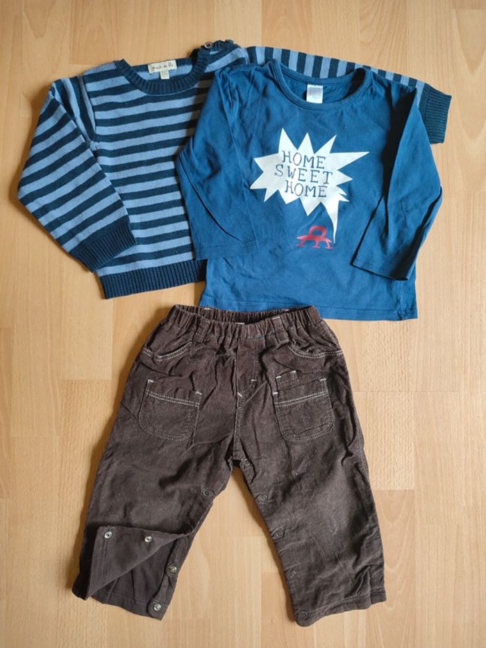 Pantalon velours côtelé doublé coton et pull en très bon état T-shirt en parfait état (en 9-12M mais taille plus grand)