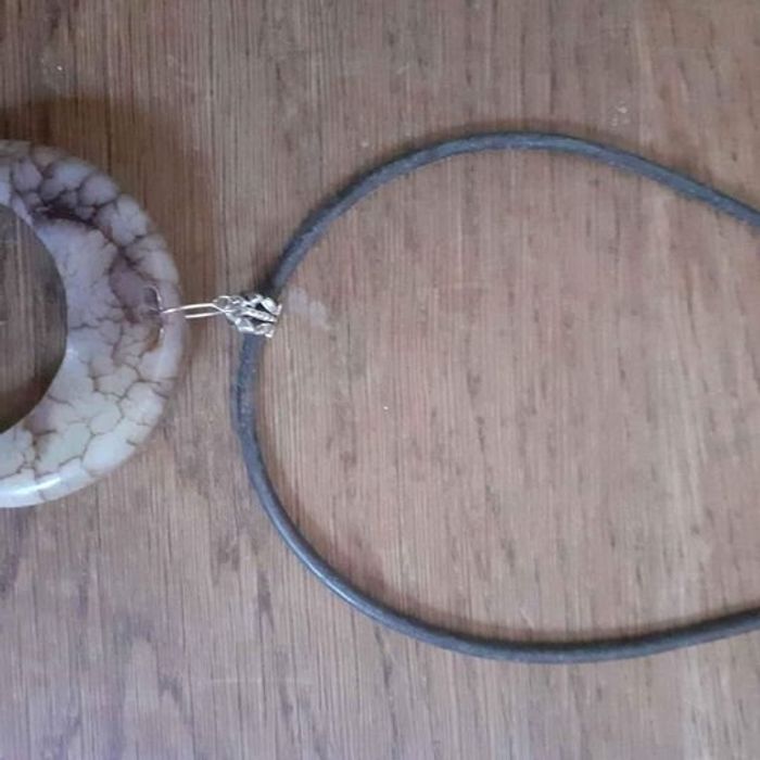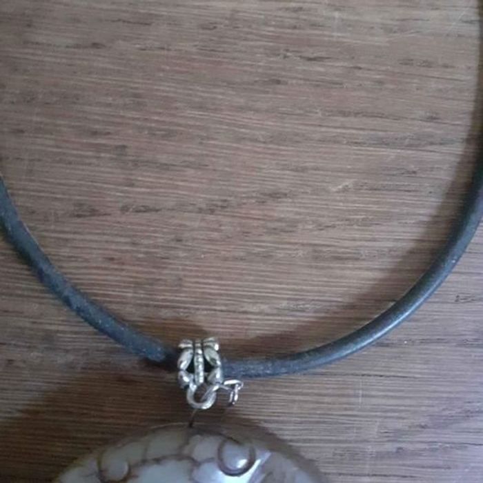 Collier avec pendentif femme Motifs lune avec gravures Matières métal, tissu et pierre imitation nacre Couleurs argenté, noir et beige En très bon état Dimensions approximative chaîne détacher 52cm de long Pendentif 5cm de long et 5,5cm de large
