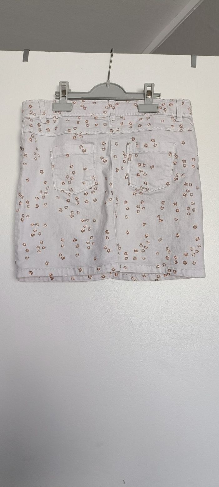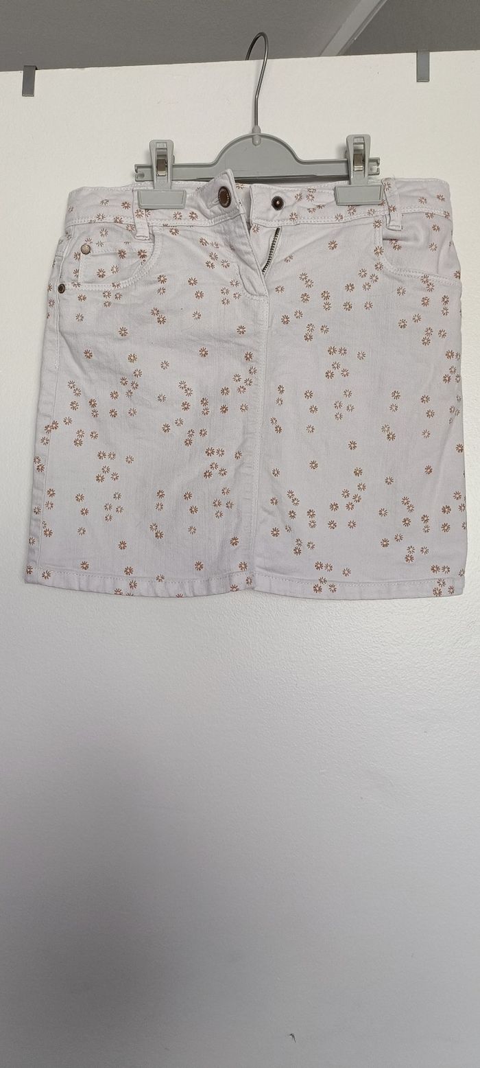 Jupe en jean fille en taille 12 ans de la marque Vertbaudet de couleur blanche avec motif fleur en rose poudrée argenté. En très bon état