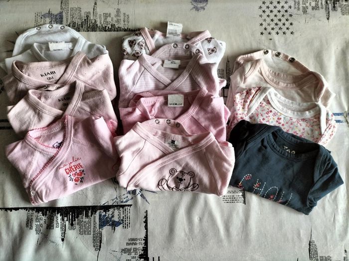 Lot bodys différentes marques (TAO, mots d'enfants, pommette, Kiabi). Ouverture facile par devant sauf 3 à enfiler. Taille naissance #naissancefillegaelle