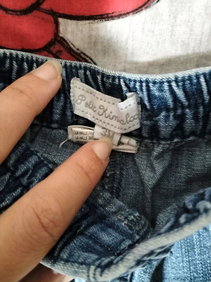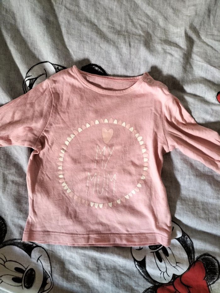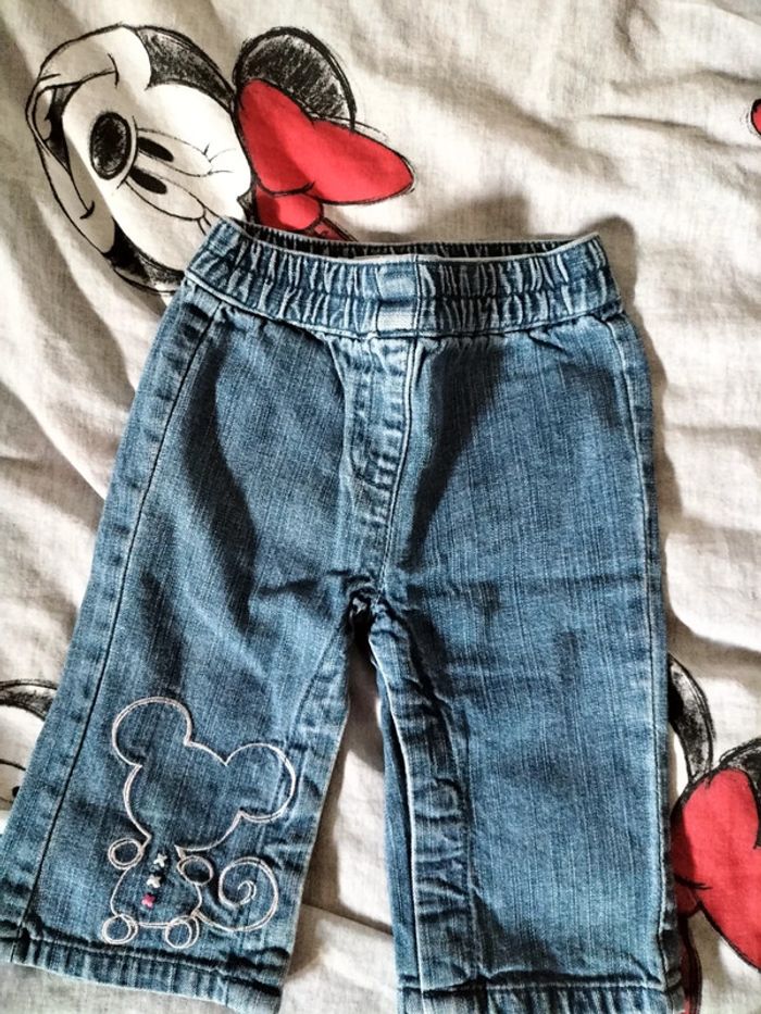 T-shirt manches longues rose pâle marque Kiabi et taille 6 mois. Pantalon en jean avec souris brodé marque Petit kimbaloo et taille 3 mois mais taille grand. Le tout en très bon état. #6moisfillegaelle