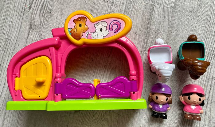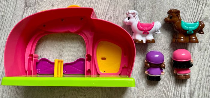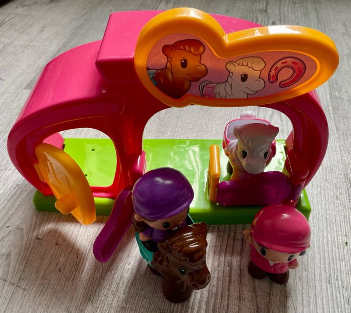 Jouet centre équestre avec deux chevaux et deux figurines qui vont dessus Traces d’utilisation Occasion, bon état