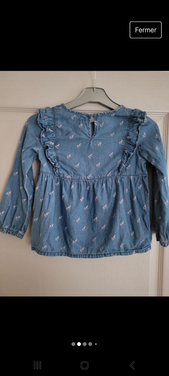 🌸 Blouse 100% coton en jean avec imprimé rose 🌸 Article portée 3/4 fois reste en très bon état 🌸 Taille 6 ans ( taille marque)