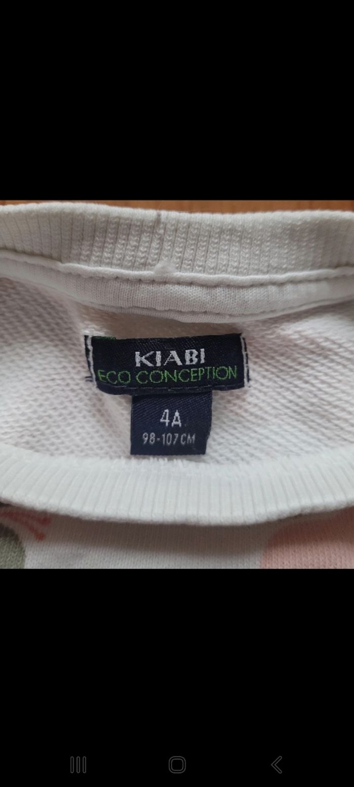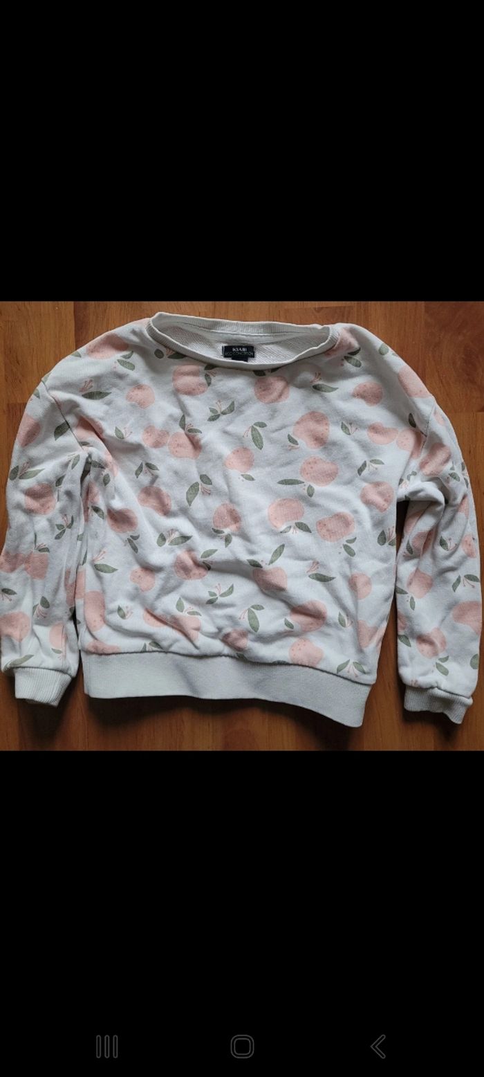 🌸 Sweat kiabi imprimé pêche. 🌸 Porte quelques fois 🌸 Taille 4 ans (marque soit 98/107cm) 🌸 Très bon état général mis à part une légère tache bleu sur la manche gauche (photo 5)