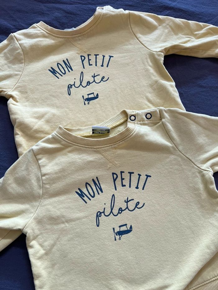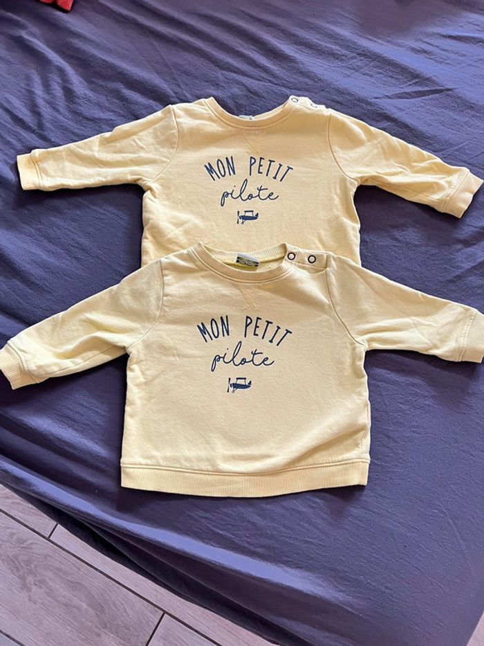 Lots deux pull indetiques jaune en bon état Marque : Tape à l’œil Taille : 9 mois