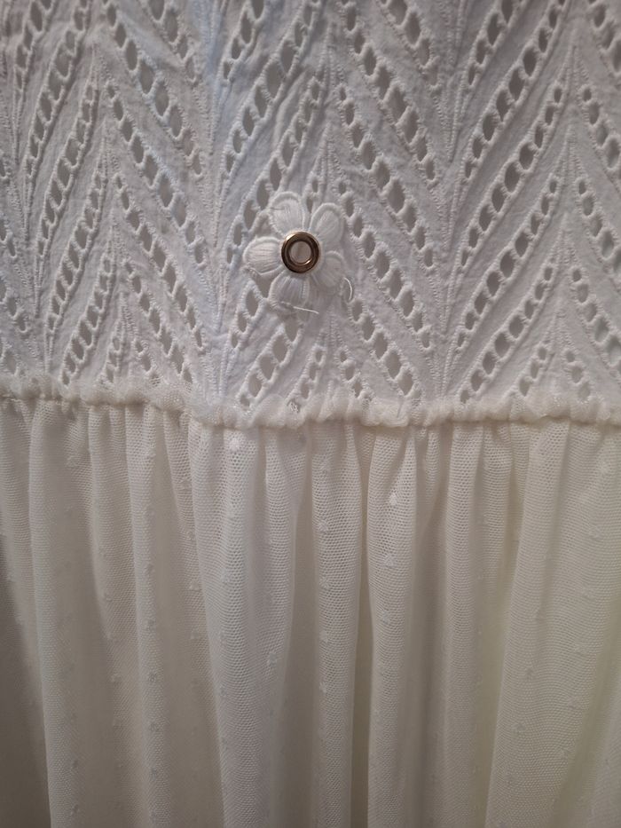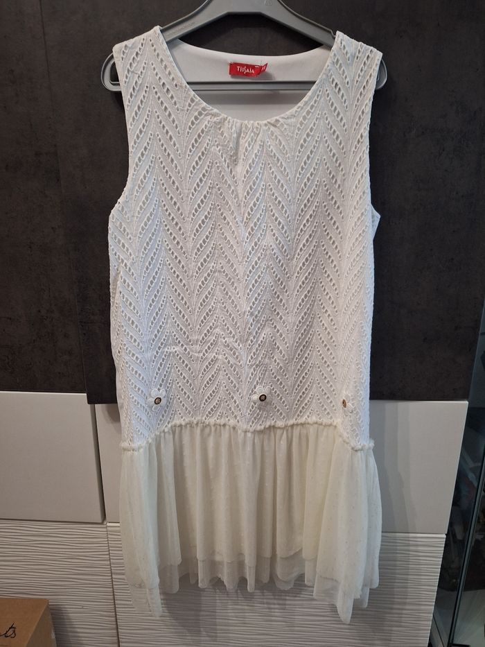 Jolie robe sans manches blanche entièrement doublée, macramé devant, voile tulle au bas, 3 petites fleurs devant, marque Tissaïa, taille 14 ans, très peu portée comme neuve