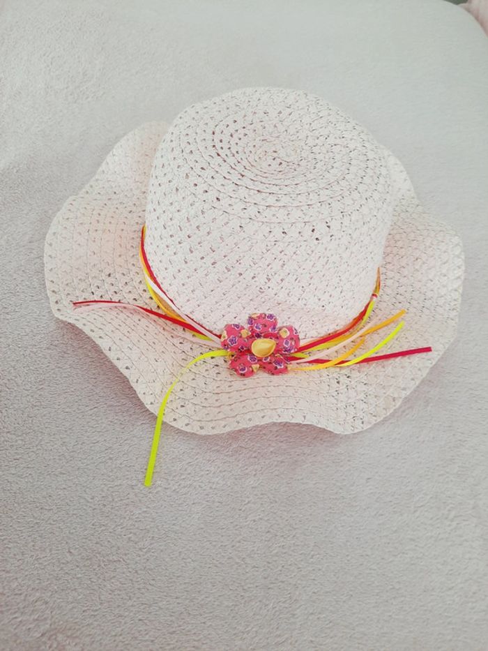 Chapeau de paille fille Lili Marelle 53 cm Rose clair avec fleur et noeuds décoratifs rose fuschia et jaune Très bon état