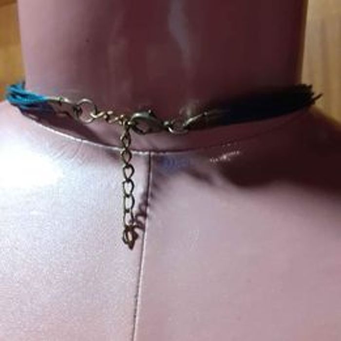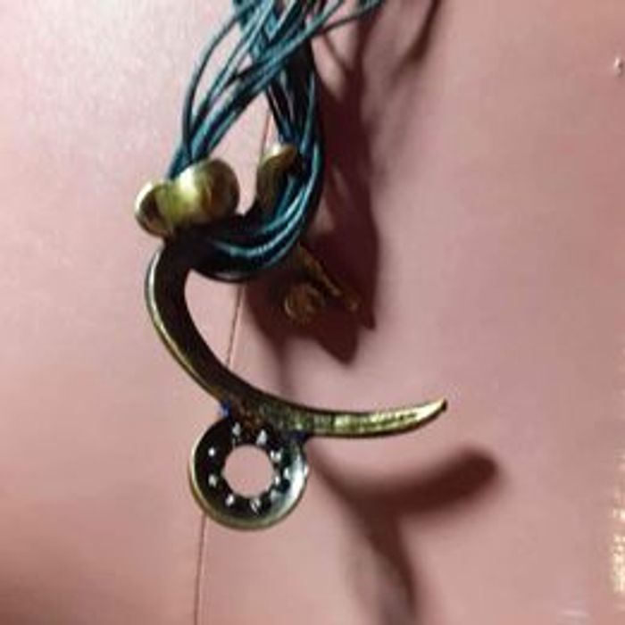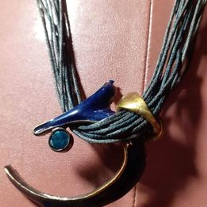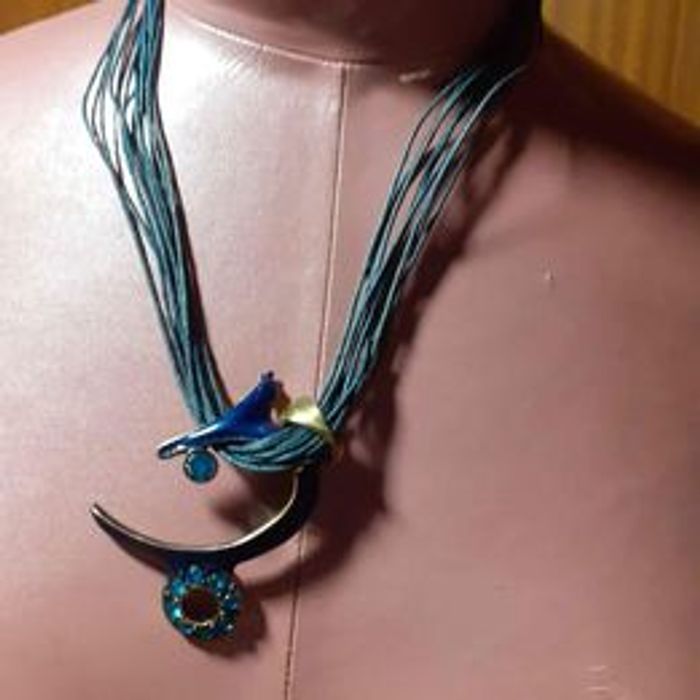 Collier avec pendentif fantaisie réglable pour femme Matières métal, strass et cordelettes Couleurs doré et bleu foncé et clair Motifs abstrait En très bon état Dimensions approximative 51cm de long détacher : pendentif 6,5cm de long et 6cm de large