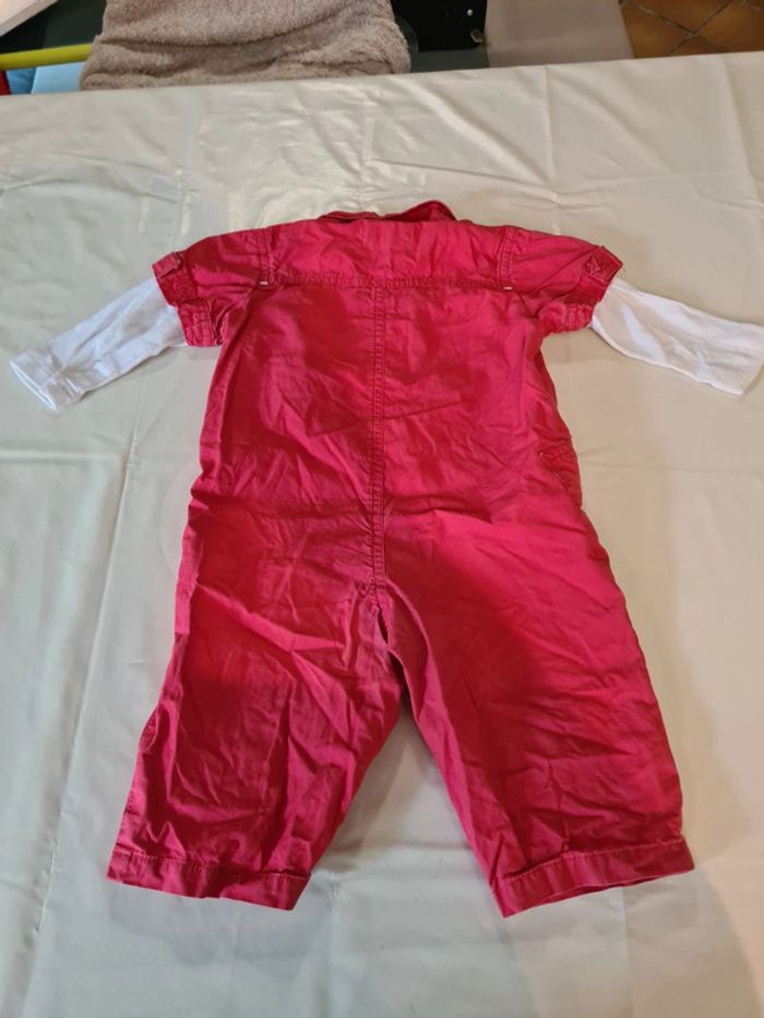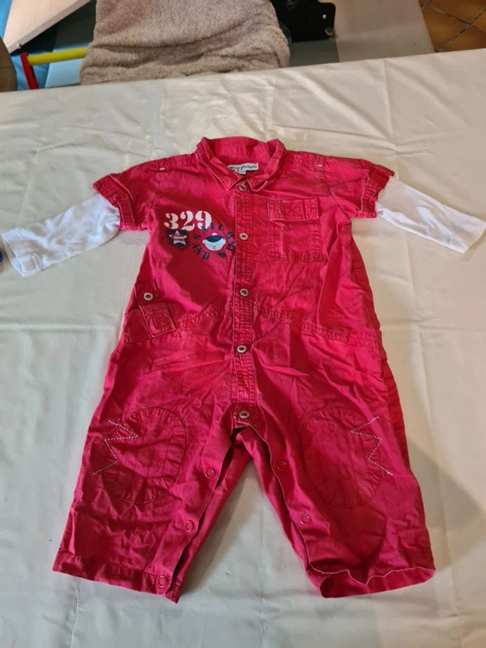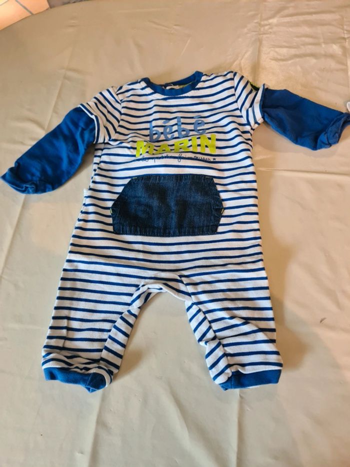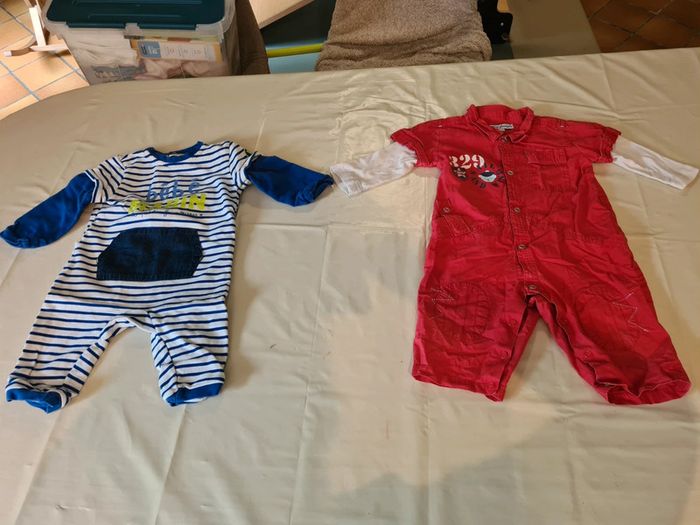 1 combi coton Assez epaise Orchestra 9M 71 cm. Ouverture au dos comme un pyjama. 1 combi Mini Jungle 9M ouverture devant et entrejambes. Très fine. Manches blanches tâchées