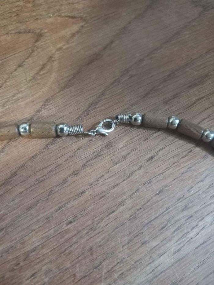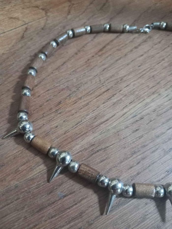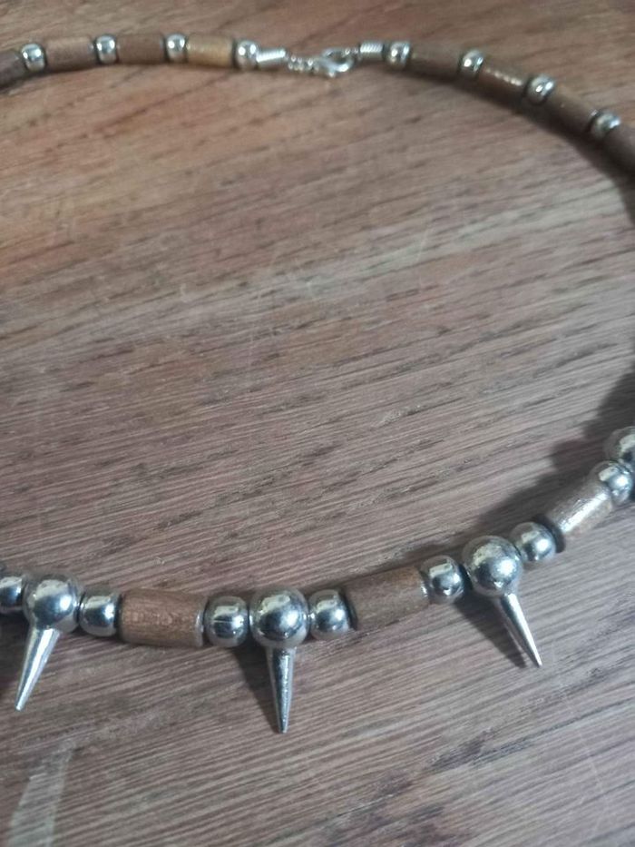 Collier mixte Matières métal et bois Forme piques Couleurs argenté et marron En très bon état Dimensions approximative collier 46cm de long - Piques 2cm de long