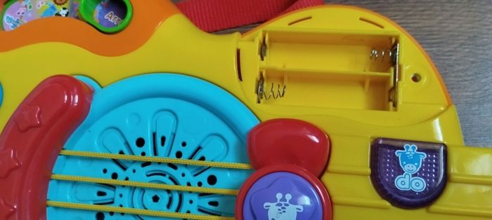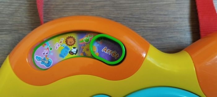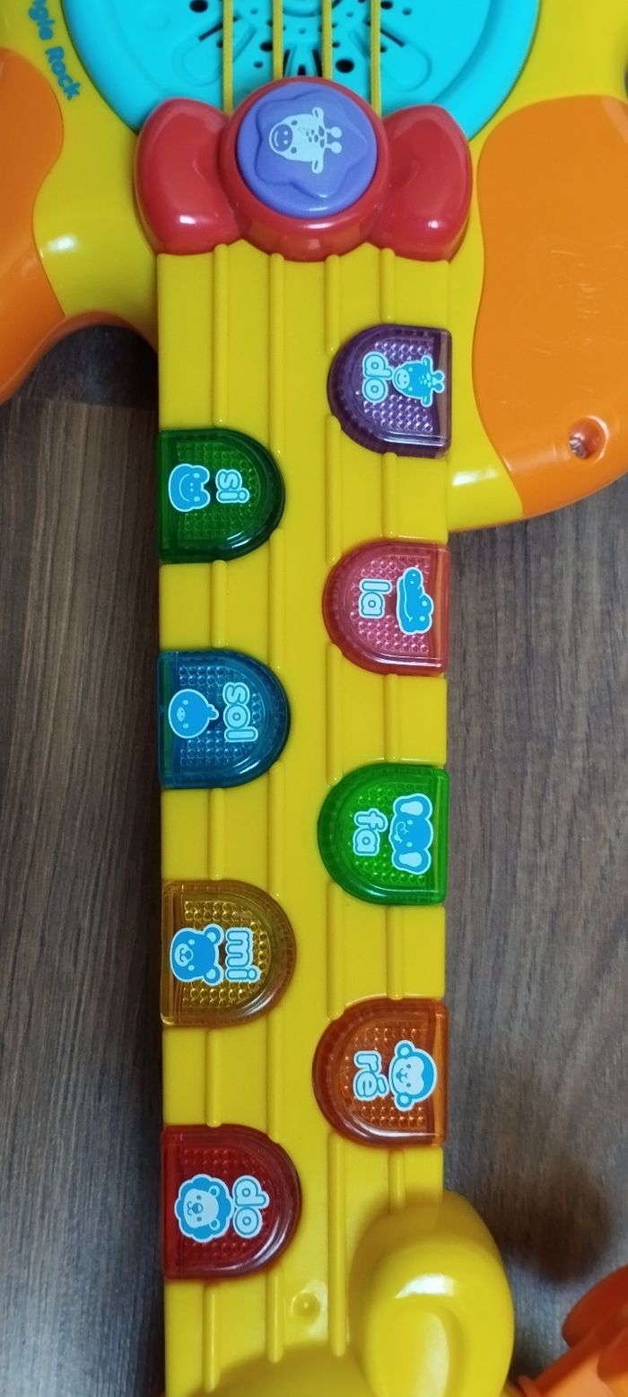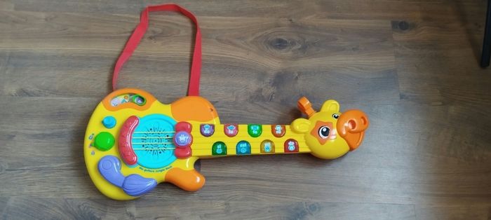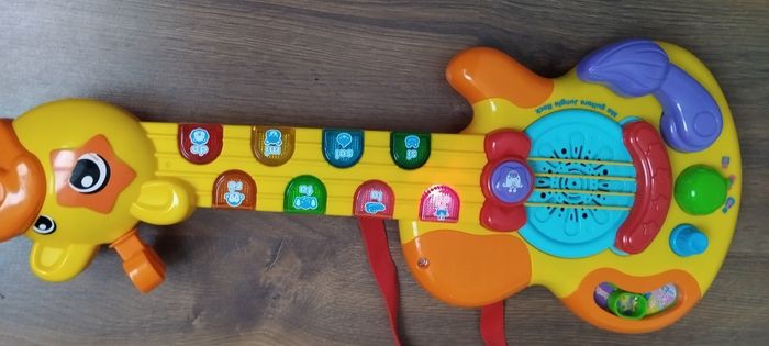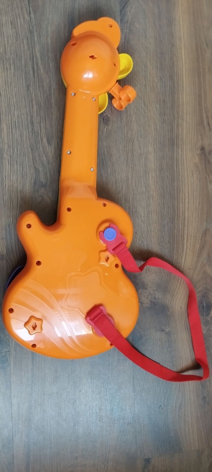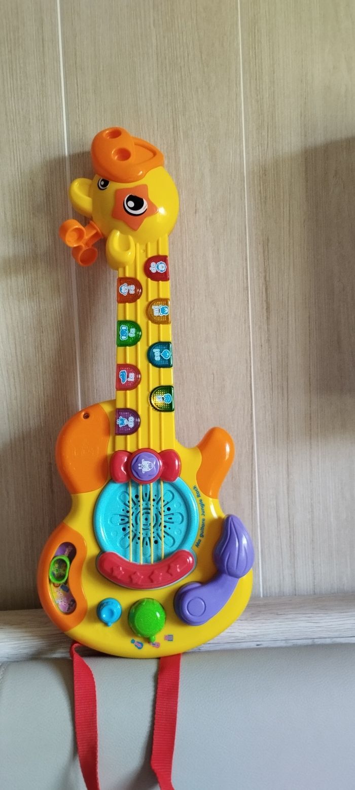 Guitare girafe avec sangle amovible Oui tous lumineuse pour déclencher les mélodies Un bouton jungle rock pour entendre la girafe et ses amis jouer et chanter en groupe 3 modes musicaux, guitare folk, classique ou électrique 11 chansons, 19 Melody et des sons rigolo d'animaux 3 niveau sonore et arrêt automatique Des 18 mois La note Ré fonctionne mais ne s'allume plus. Marque Vtech Prévoir deux piles LR6 Très bon état .