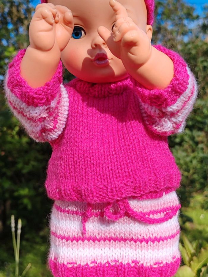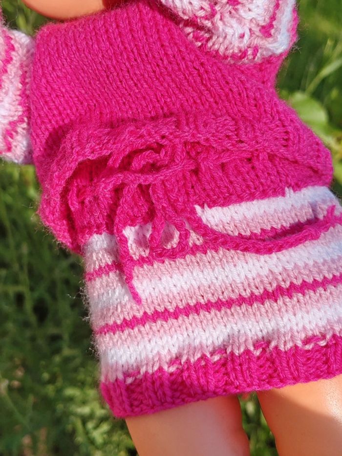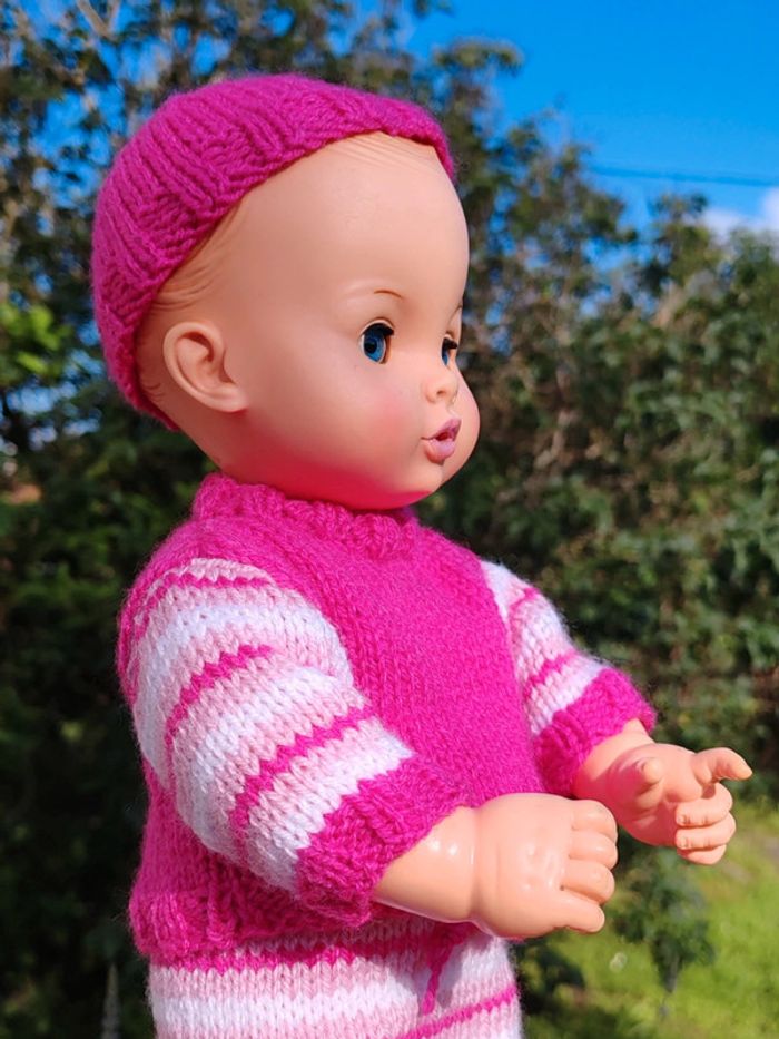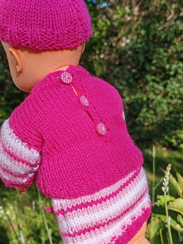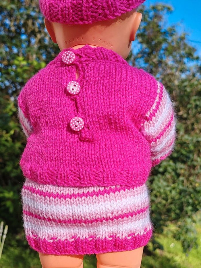 ⚠️ la poupée n'est pas à vendre, seulement sa tenue !! La tenue est composée de : - un pull rose avec rayures sur les manches et fermeture par boutons dans le dos - un bonnet assorti également en tricot - une jupe à rayures roses Convient aux poupées de 30 à 35cm, taille ajustable aisément Tricotée main Très bon état Modèle unique ➡️ #ursullabuffaypoupees #creationsdursulla