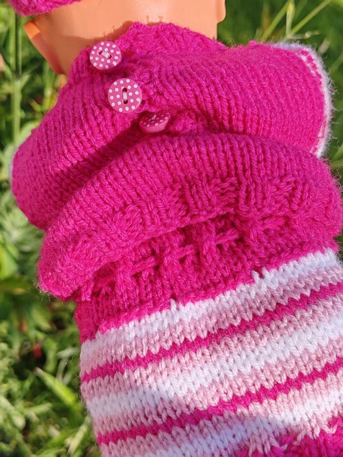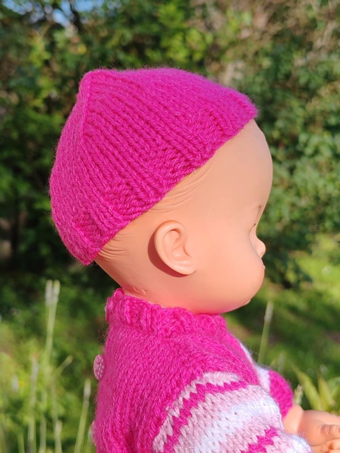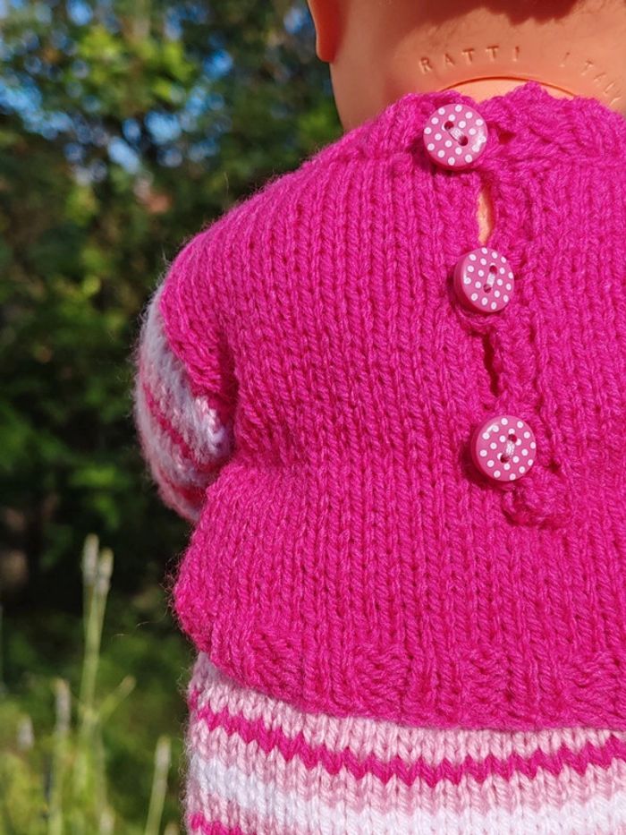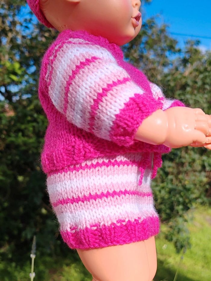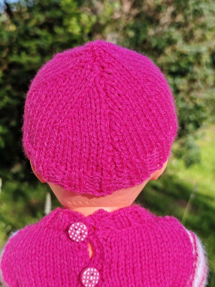 ⚠️ la poupée n'est pas à vendre, seulement sa tenue !! La tenue est composée de : - un pull rose avec rayures sur les manches et fermeture par boutons dans le dos - un bonnet assorti également en tricot - une jupe à rayures roses Convient aux poupées de 30 à 35cm, taille ajustable aisément Tricotée main Très bon état Modèle unique ➡️ #ursullabuffaypoupees #creationsdursulla